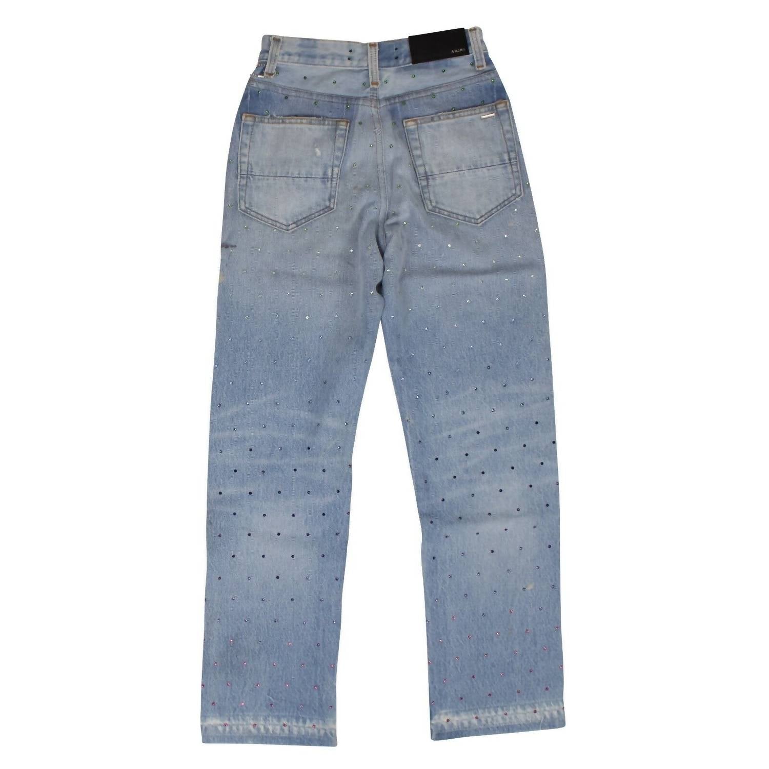 Introducing the Women's Gradient Crystal Recon Denim Jeans by Amiri, a standout in multi-indigo for the fashion-forward wardrobe. Crafted entirely from cotton, these straight-leg jeans offer a relaxed fit with subtle texture, embodying streetwear trends. Made in the US, they feature a button closure and practical pockets, perfect for your vacation outings or Easter celebrations. To maintain their quality, dry clean only.