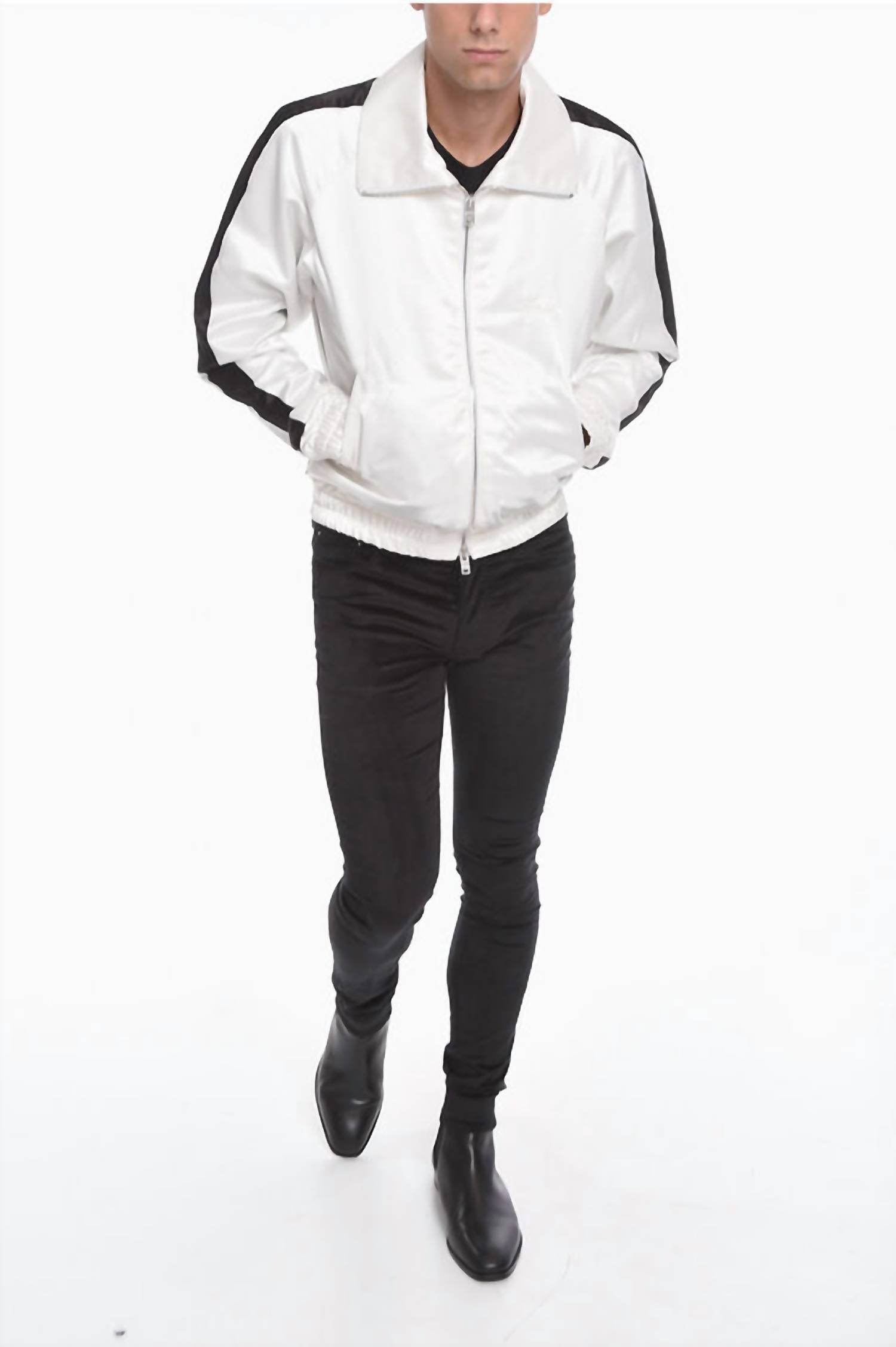 Embrace sleek style with the Amiri Zip Track Stripe Jacket in White Black, designed for a minimalist winter look. This performance jacket features long sleeves, a collar neckline, and a solid pattern, crafted from a luxurious cotton blend. Made in Italy, it includes convenient zip closure, lined interior, and pockets for practicality. Ideal for a New Year's Eve occasion, care for this piece with dry clean only instructions.