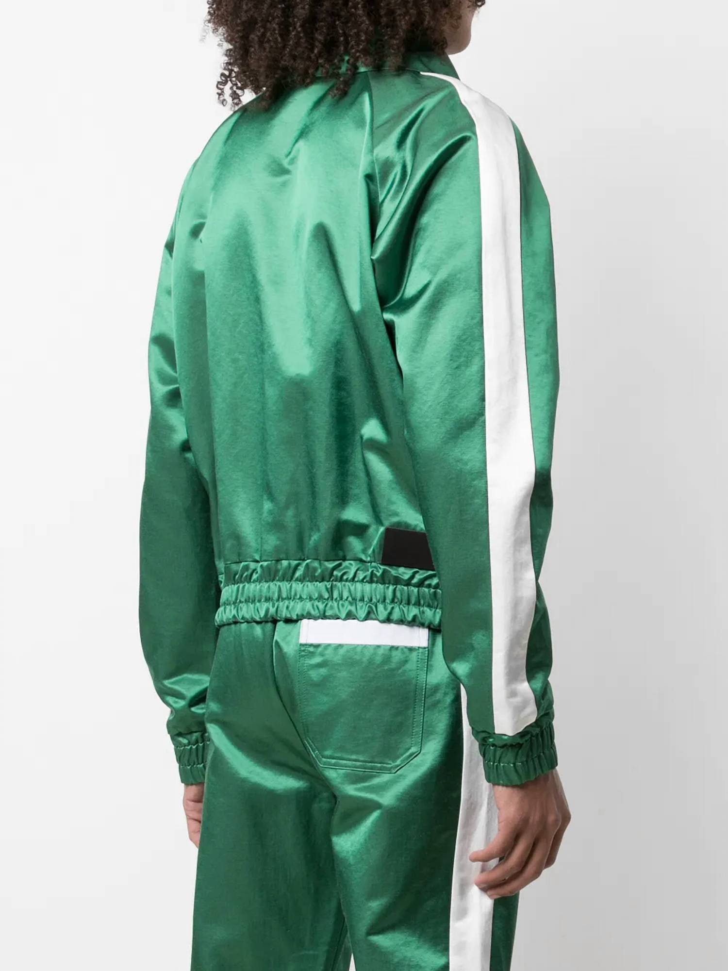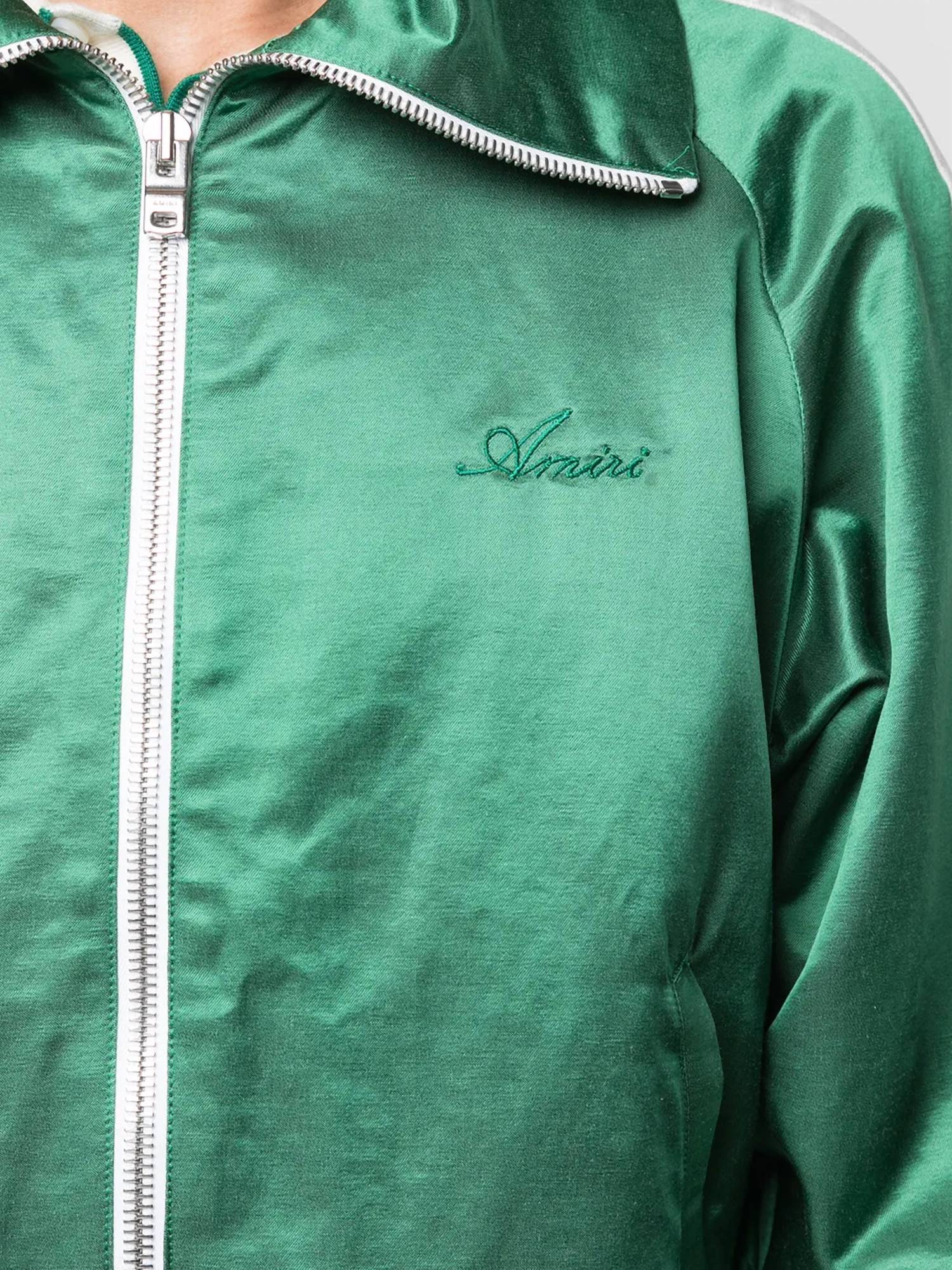 Elevate your winter wardrobe with the Amiri Zip Track Stripe Jacket Plus, perfect for a holiday party with its minimalist aesthetic. This men's jacket features long sleeves crafted from a cotton-blend satin, colored in Tennis Green and White with a stylish embroidered logo at the chest. It boasts a front zip closure, a spread collar, side stripe detailing, and practical two side slit pockets. Care for this piece by dry cleaning, and enjoy its luxurious feel throughout the season.