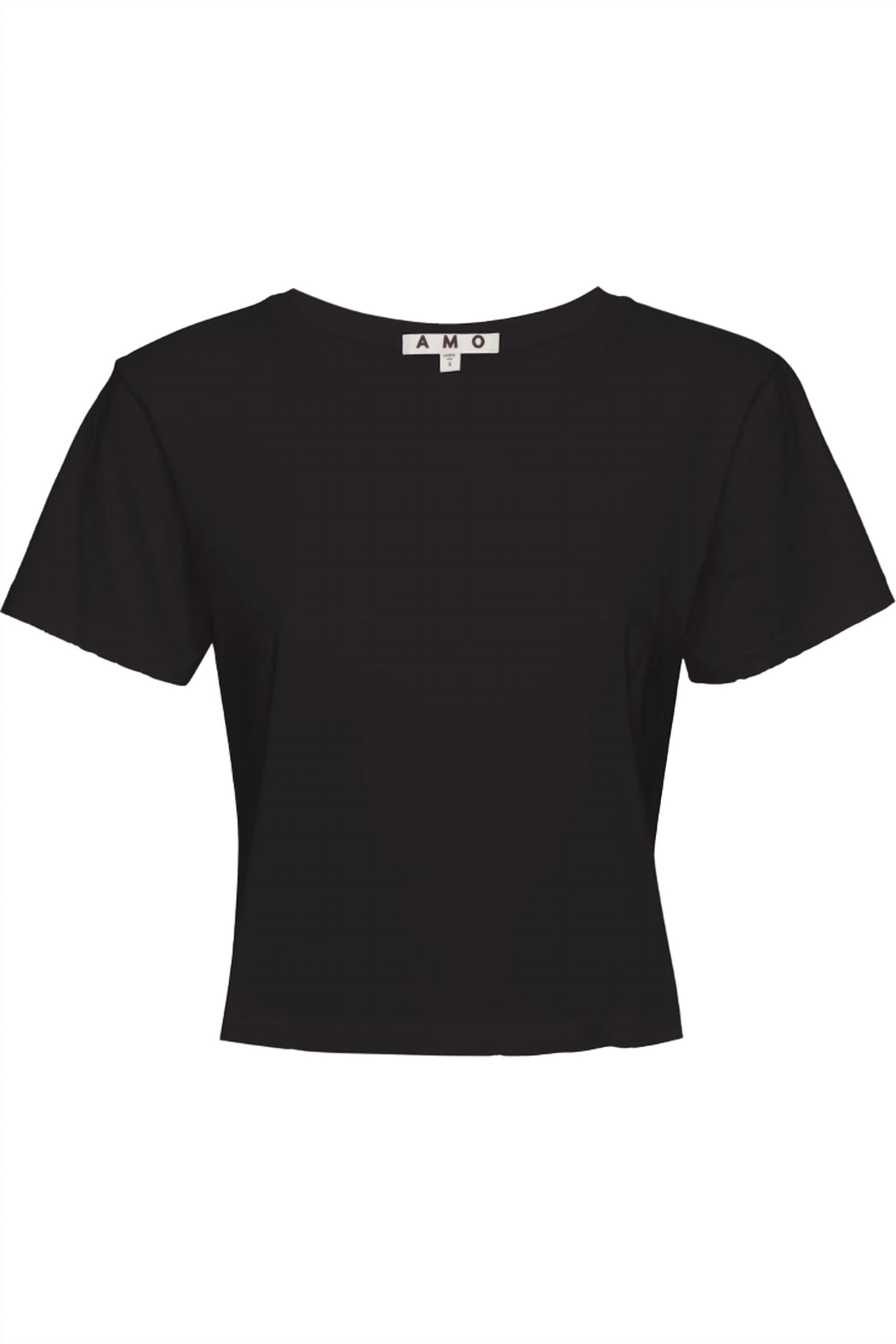Introducing the Babe Cropped Tee by AMO, a minimalist summer essential perfect for pairing with high-waisted jeans. This short sleeve tee comes in a versatile black color and is crafted from 100% cotton, ensuring both comfort and a chic look. It features AMO's signature double needle side seam detail, tonal topstitching, and subtle distressing around the edges for a stylish, worn-in feel. With a convenient pull-on closure and care instructions for machine wash cold and tumble dry low heat, this tee is made with love in Los Angeles for your ultimate vacation wardrobe.