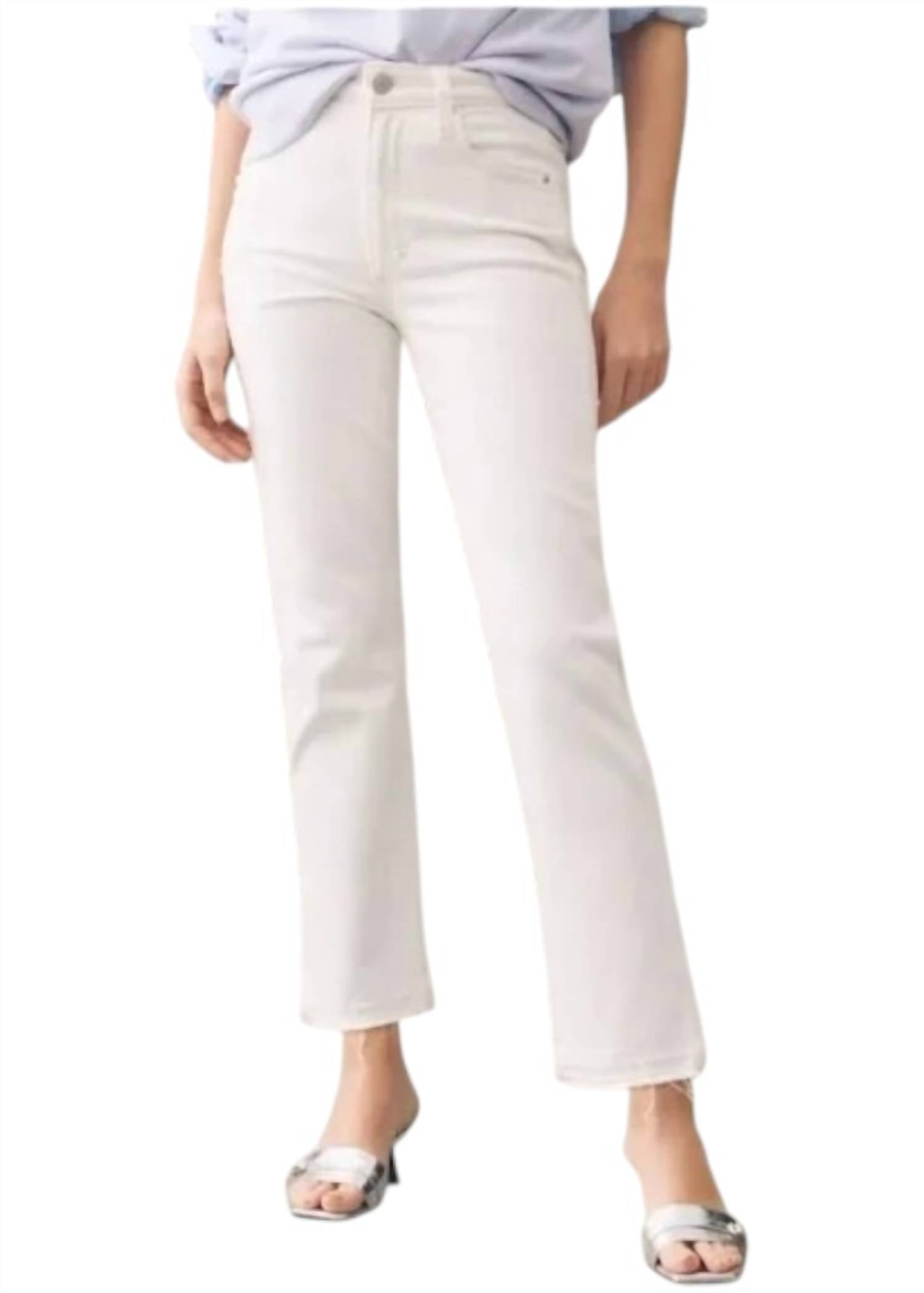 Introducing the Chloe Crop Jeans by AMO in White Sands, perfect for a modern streetwear vibe. These high-rise jeans feature a straight, cropped leg with a released hem, and are crafted from a Cotton Blend for a figure-flattering fit. The jeans come with a zip closure, 5-pocket styling, and offer a mid-weight denim feel with a touch of stretch for comfort. Measurements include a 26" inseam, 10.75" front rise, and a 13" leg opening; care instructions are machine wash cold with a tumble dry on low heat.
