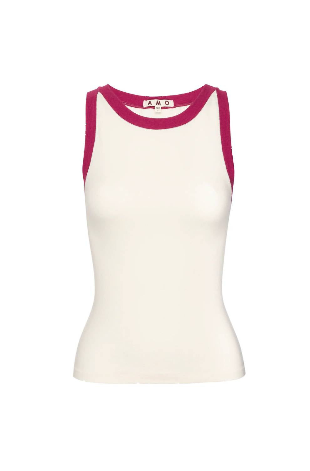 Find your perfect summer staple with the Dazzling Tank by AMO, designed for effortless style in a bone/pinot hue. This sleeveless piece is crafted from a comfortable cotton blend and features a classic crewneck, finished with contrast trims for a sporty touch. Originating from the US, it offers a pull-on closure for easy wear. Care is a breeze with machine wash instructions.