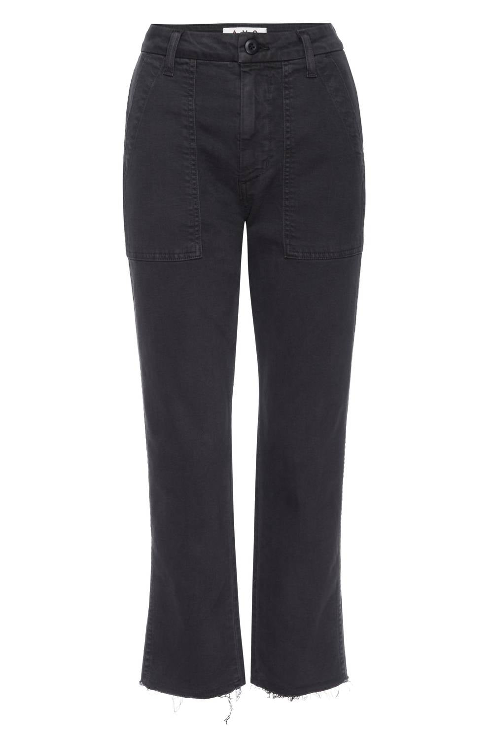 The AMO EASY ARMY TROUSER is a relaxed, cropped straight pant featuring a single button and zip fly, with patch pockets on the front and back. Measurements: Inseam 25.5", Front Rise 11.5", Back Rise 15.5", Leg Opening 14.75" (size 27). Fabric composition is 70% cotton, 29% Tencel, and 1% elastane. Care: machine wash cold, hang dry or tumble dry low. Made in Los Angeles.