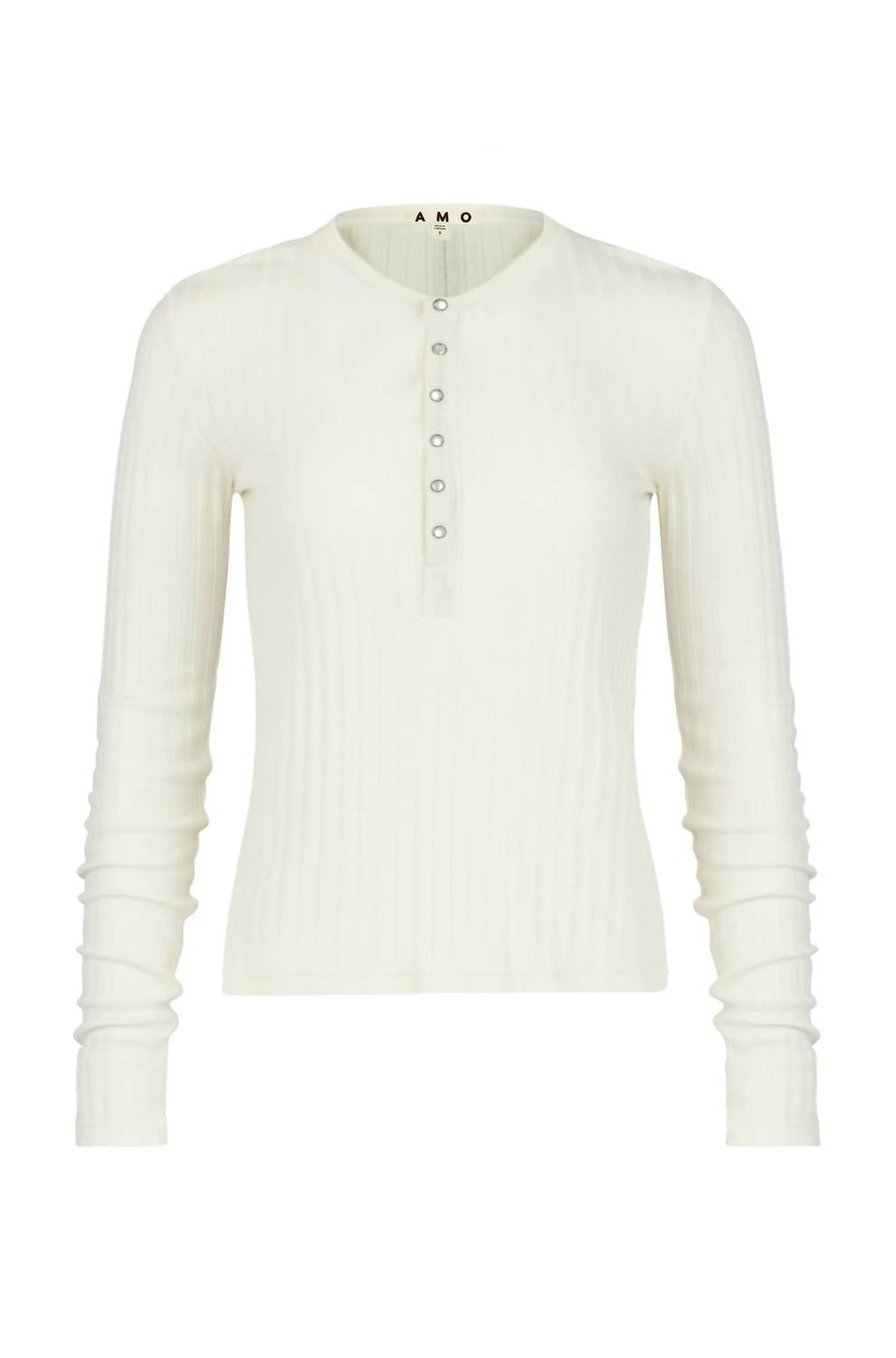 Experience the effortless style of the AMO Lottie Top, a fitted long sleeve tee perfect for spring. Crafted from a textured cotton blend in a charming bone color, this top features a crewneck design and a sleek snap-front placket for a polished look. Originating from Portugal, it ensures quality and comfort with a convenient pull-on closure. Care is simple with machine wash instructions.
