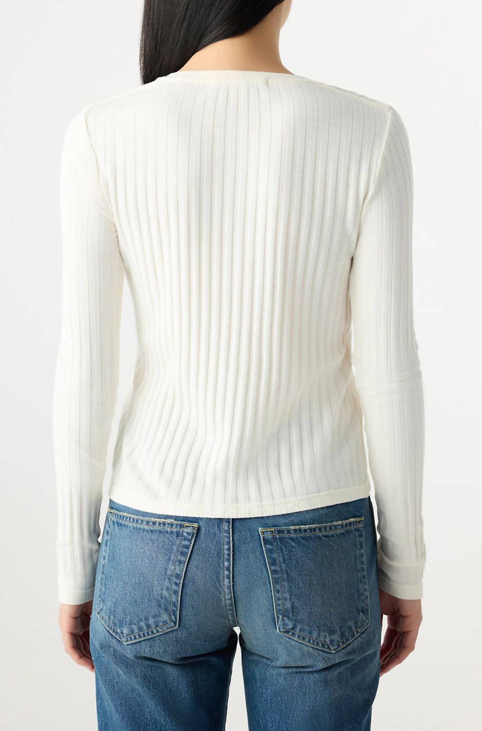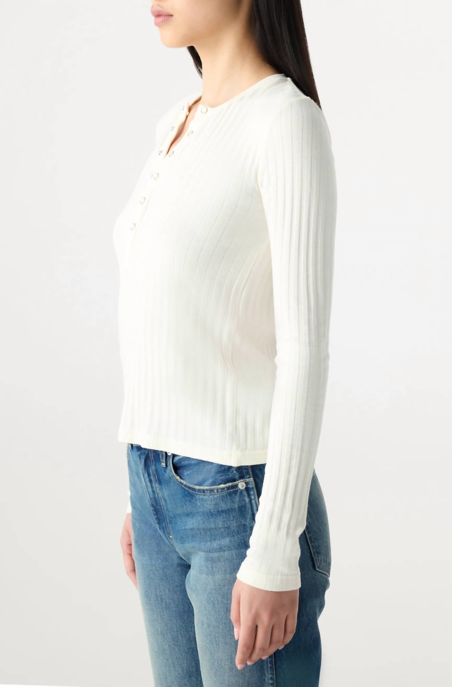 The perfect long sleeve tee that goes with just about anything. Experience the effortless style of the AMO Lottie Top, a fitted long sleeve tee perfect for spring. Crafted from a textured cotton blend in a charming bone color, this top features a crewneck design and a sleek snap-front placket for a polished look. Originating from Portugal, it ensures quality and comfort with a convenient pull-on closure. Care is simple with machine wash instructions.