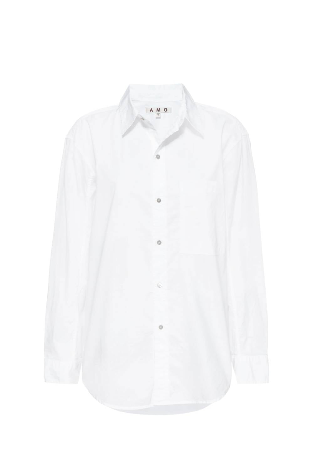 Introducing the AMO Ruth Oversize Shirt, an essential addition to your vacation wardrobe in crisp white. This everyday shirt is designed with an oversized fit, featuring a classic collar, a single chest pocket, and a shirt-tail hem, all secured with elegant shell buttons. Made from 100% stonewashed cotton poplin, this 29" length shirt from Peru ensures comfort and style. Easy to care for with machine wash instructions, it's perfect for effortless, minimalist spring outings. Model is 5'10" wearing a size small.