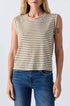 Introducing the AMO Women's Sleeveless Love Top in the vibrant Reseda Multi, an essential for any wardrobe. Made from a 52% linen and 48% polyester blend, this top features a natural, soft texture perfect for summer wear. The relaxed scoop neck silhouette and fine stripes add a touch of effortless style. Length: 24" from shoulder; Chest: 37.5", with measurements taken from a size small. Crafted with care in Los Angeles, it's designed for easy pull-on wear. Care instructions: Machine wash cold, tumble dry low. Model Sarah is wearing size S and stands at 5'9.5".