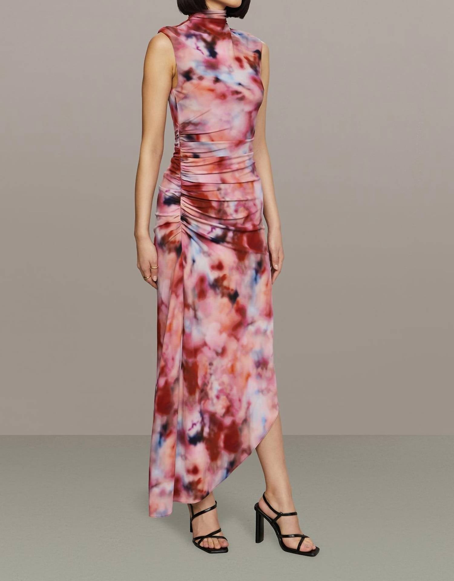 With its effortless drape and versatile design, the Kai dress is ideal for both casual outings and special occasions. Crafted from 100% viscose matte jersey, it showcases a captivating abstract print with flattering ruching at the front and back. Featuring a mock neck, asymmetric silhouette, and midi length, this sleeveless dress is partially lined for comfort and a polished finish.