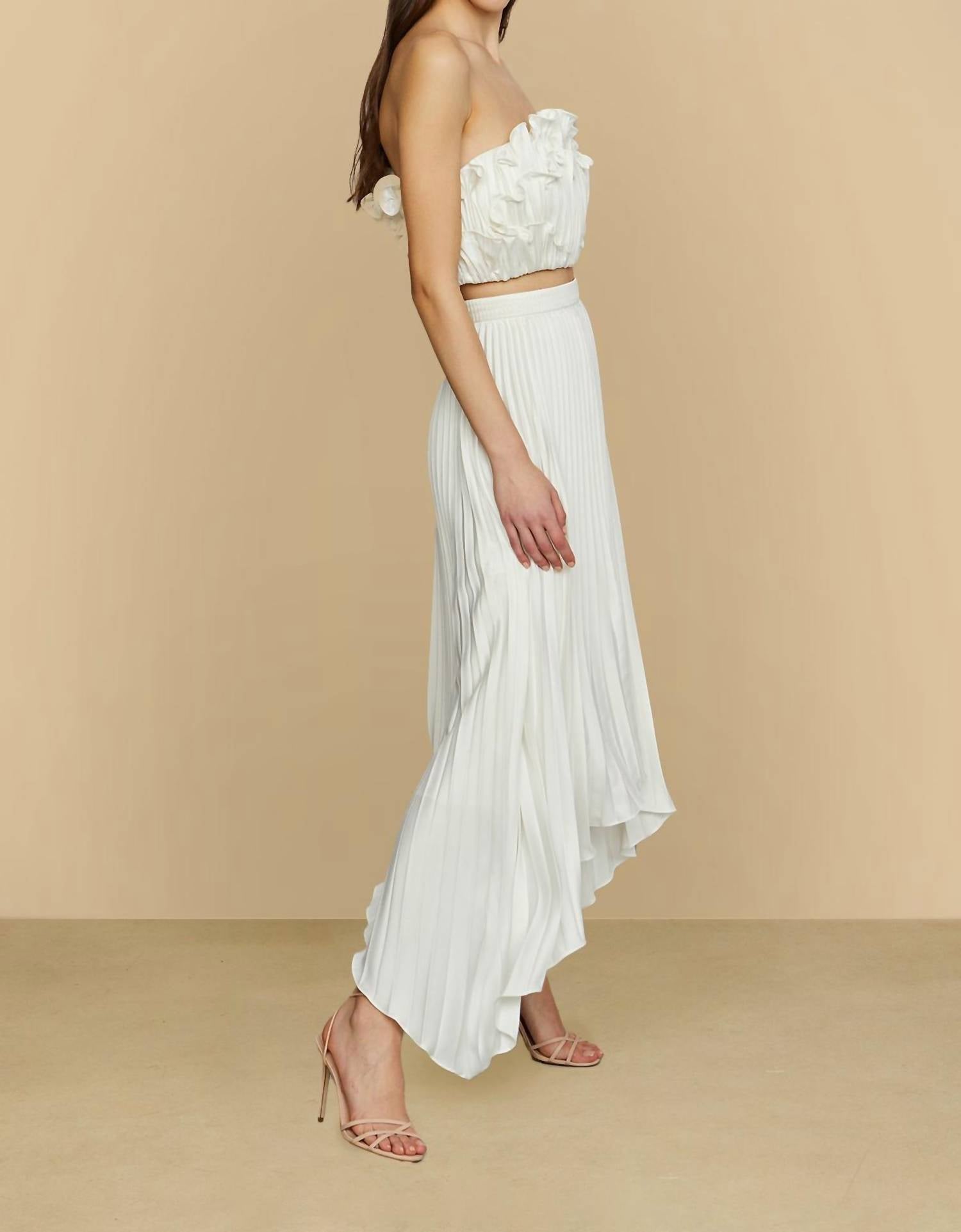 Crafted from sustainable, eco-friendly materials, this midi skirt features a pleated high-low hem that creates an elegant, flowing silhouette. Inspired by the flora of the Arizona desert, its delicate floral detailing and scalloped fish-wire finish add a refined, feminine touch. With an A-line silhouette, slim fit, and invisible back zip, it offers a sophisticated alternative to traditional evening wear. Made from 100% recycled polyester, it’s non-stretch and fully lined for a perfectly polished finish.