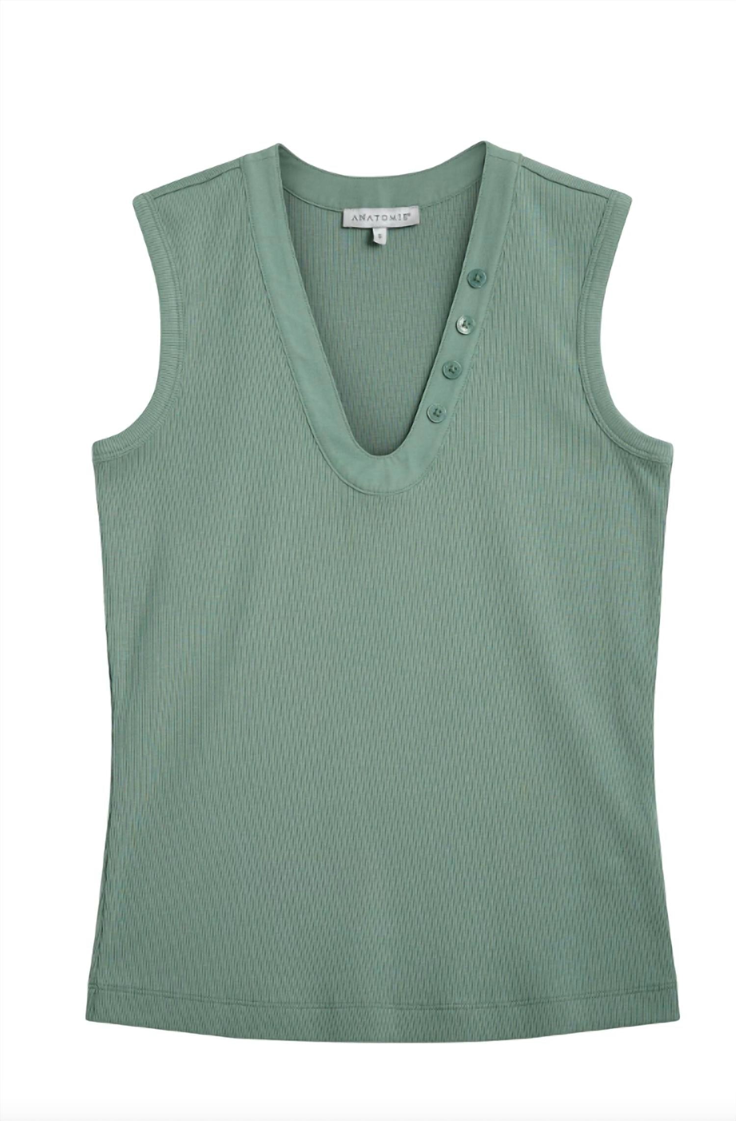 Caimento, tecido e funcionalidade. Esta regata atende a todos os requisitos. Esta blusa de corte justo e sem mangas apresenta um decote em V curvo com tecido contrastante e detalhe de botões. É um modelo tipo pulôver que termina na altura do quadril. Confeccionada em 59% algodão, 37% poliamida e 4% elastano. Lavar à máquina com água fria; não secar na secadora. A modelo tem 1,75 m e veste tamanho P.