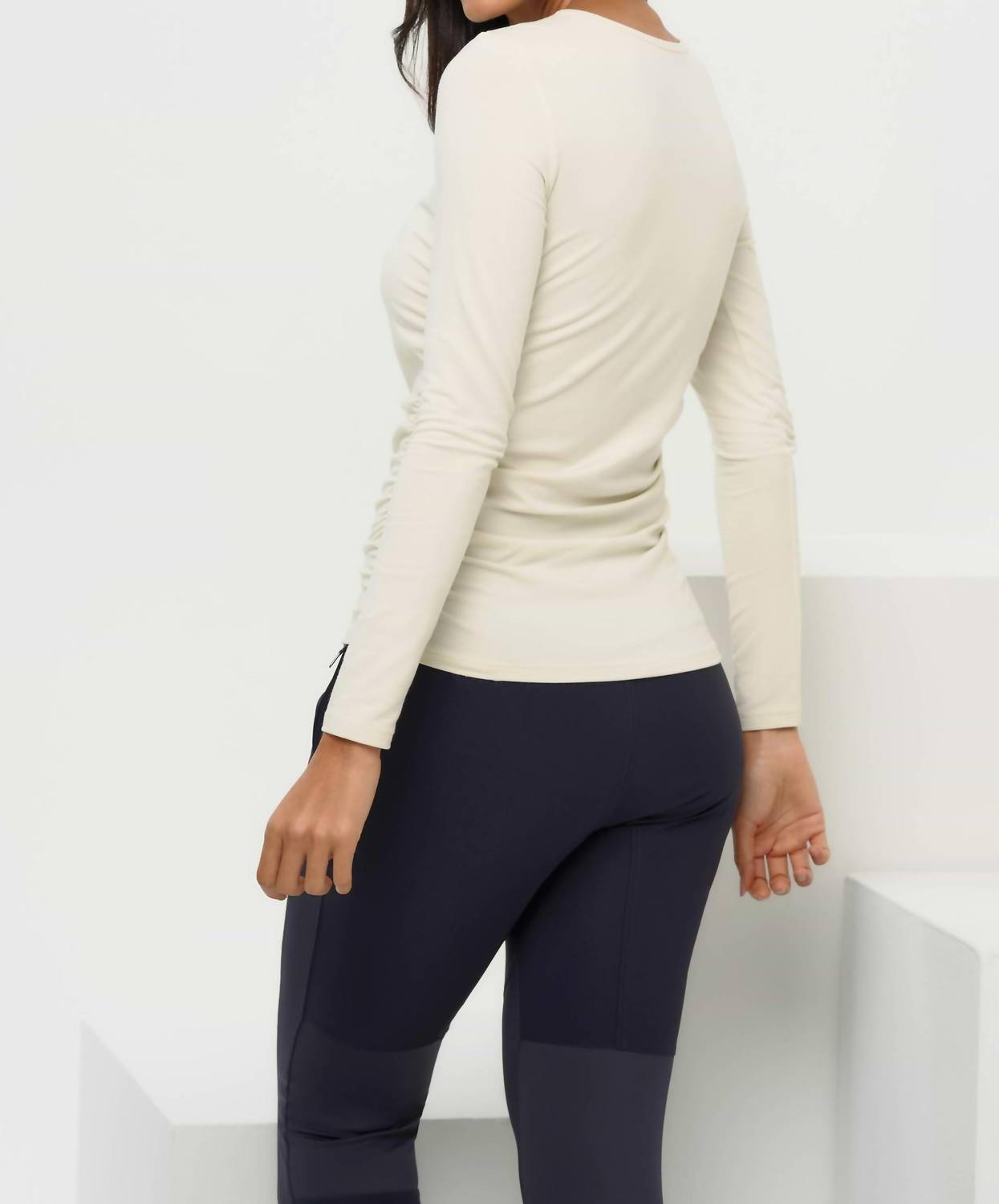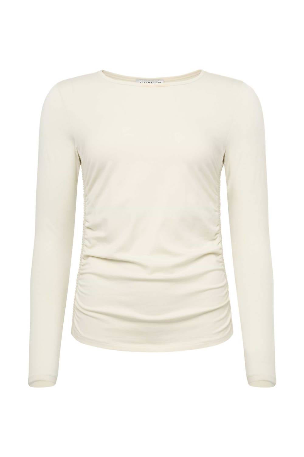 Uma blusa de manga comprida que você pode usar com jeans, saias, bem... quase tudo! Apresentamos a camiseta Milly Pima Cotton Tee da Anatomie, uma blusa elegante na cor marfim, confeccionada para conforto e estilo. Esta camiseta feminina combina mangas longas com um caimento elegante e comprimento até a altura do quadril, realçada por detalhes franzidos nas costuras laterais. Confeccionada com uma mistura luxuosa de 48% algodão Pima, 48% modal e 4% elastano, oferece o equilíbrio perfeito entre maciez e elasticidade. Fechamento: Puxe para vestir. Cuidados: Lavar à máquina com água fria e secar em temperatura baixa.