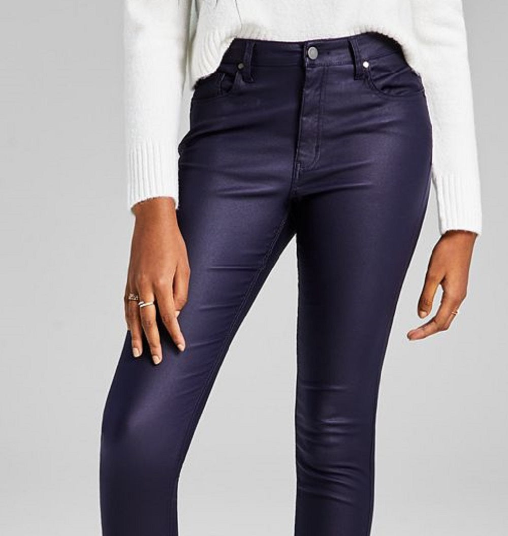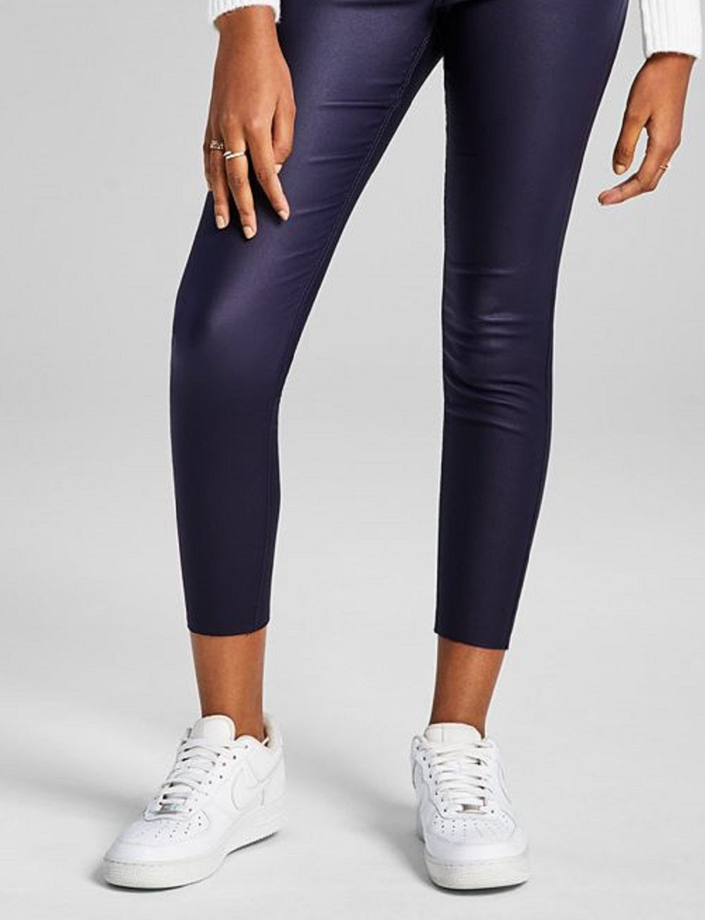 Um revestimento brilhante realça a ousadia desta calça jeans skinny versátil da And Now This. | Fecho de zíper e botão na frente; passantes para cinto | Importado | Acabamento revestido | Tamanho e ajuste |
