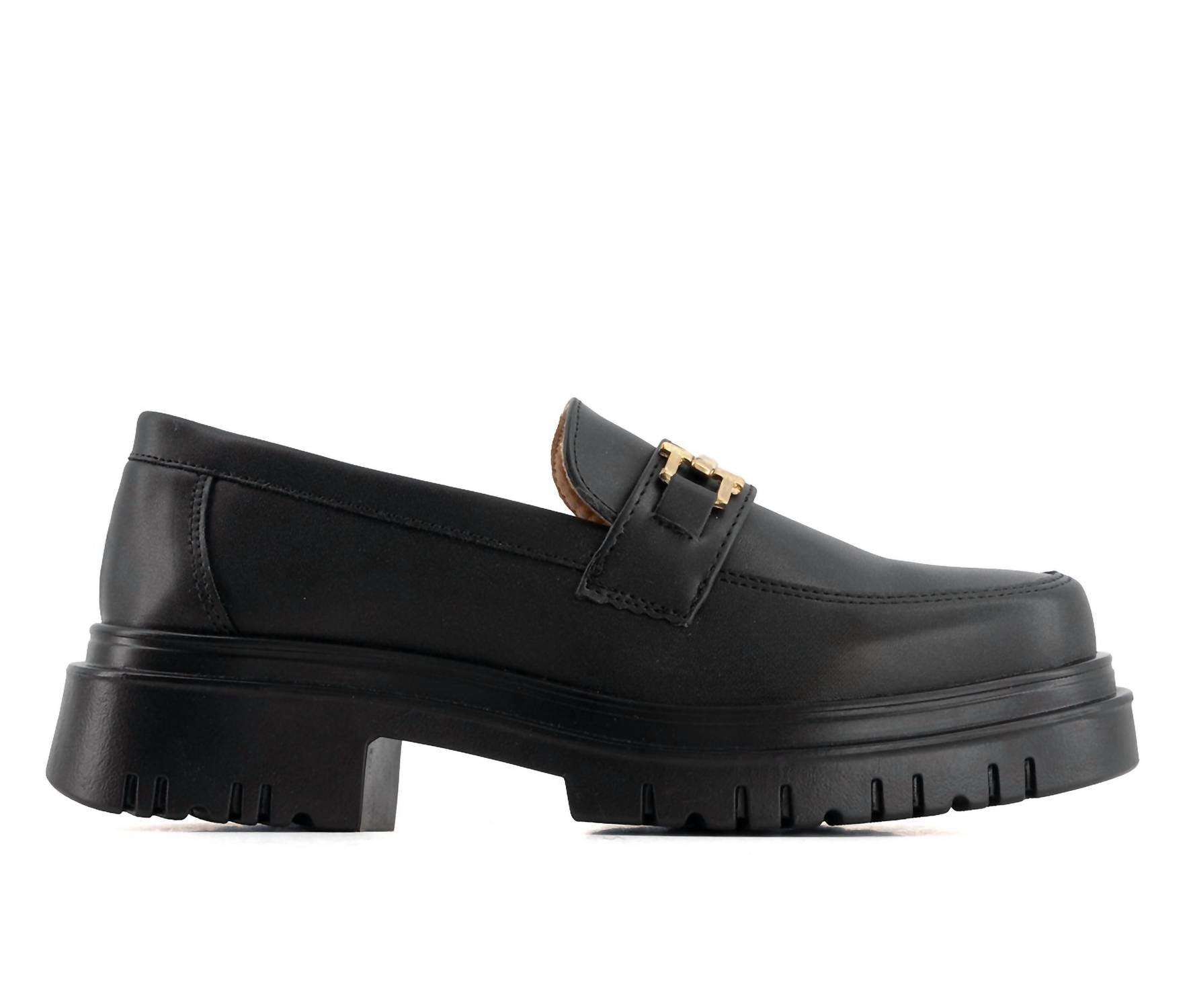 Step up your style with the Andrea Women's Black Penny Loafers, adorned with a golden ornament for that touch of luxury. Crafted from premium leather, these loafers offer both durability and sophistication, perfect for a black-tie event. Designed with a low 1.9" block heel and an almond toe shape, they effortlessly combine elegance with everyday comfort. Treat your feet to the luxurious Comfortech padded insole, ensuring a stylish and comfortable walk every time.
