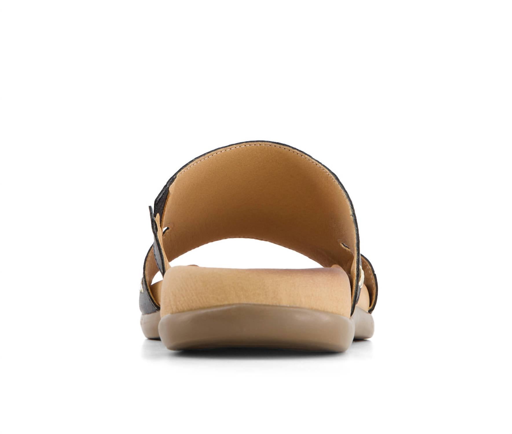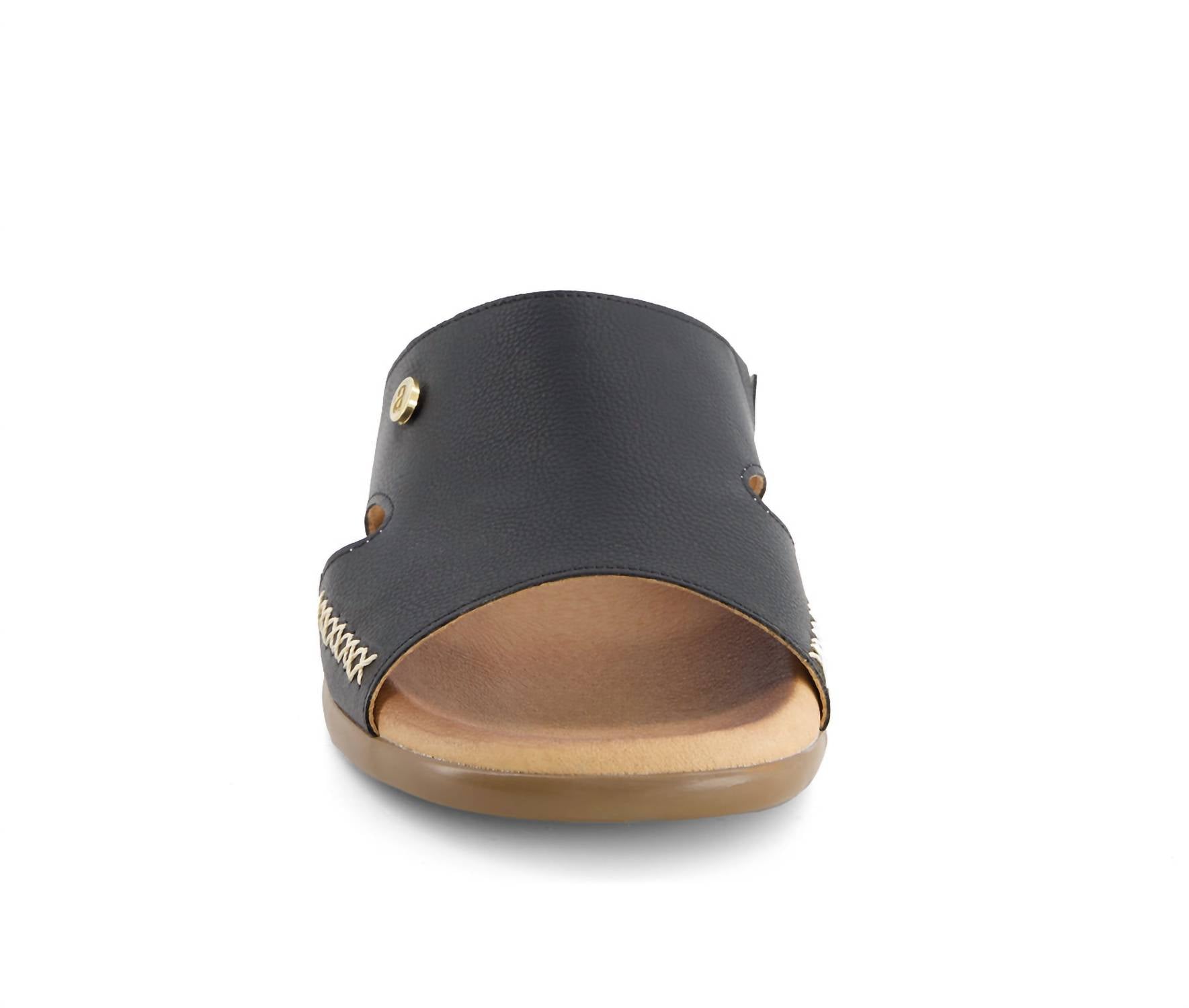 Esta sandália vai levar você do brunch ao jantar e a tudo o mais. Entre em um estilo descomplicado com as sandálias femininas slip-on da Andrea, projetadas com um elegante cabedal em couro sintético preto. Estas sandálias oferecem um estilo moderno, aberto nos dedos e com salto baixo, perfeito tanto para uso profissional quanto para passeios. O solado de borracha antiderrapante durável é combinado com uma palmilha Comfortech de espuma viscoelástica, garantindo uso durante todo o dia. Ideal para a mulher antenada na moda que busca conforto sem abrir mão do estilo.