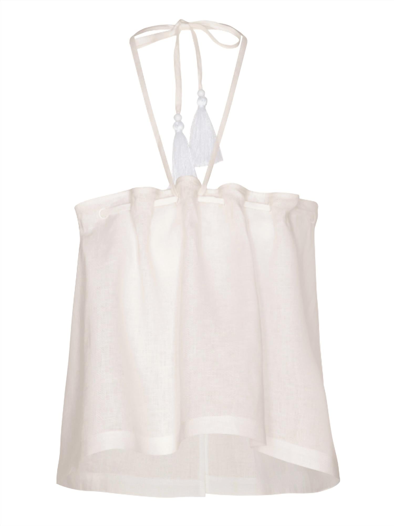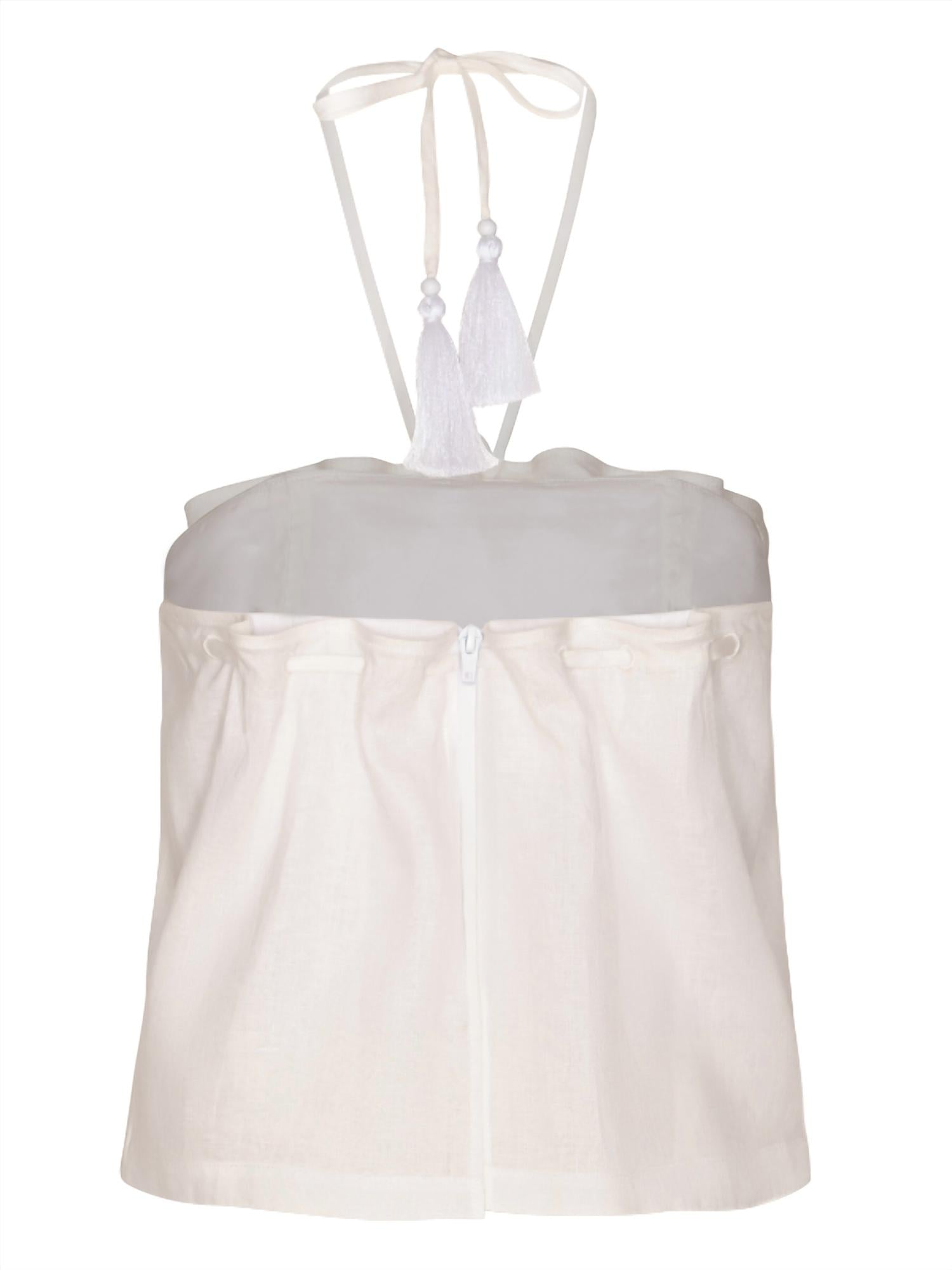 Combine isso com seus jeans e chinelos favoritos para sua próxima noite entre amigas. Apresentamos a Blusa Caricia Eterna de Andres Otalora, uma obra-prima sem mangas, criada para a elegância natural do verão. Confeccionada em 100% linho, esta blusa estilo halter off-white apresenta pregas suaves em toda a sua silhueta cropped, oferecendo uma mistura de frescor e romantismo. Feita com maestria na Colômbia, possui um fecho de zíper seguro, garantindo um ajuste perfeito ao seu guarda-roupa de férias. As instruções de cuidado recomendam lavagem a seco para manter seu charme minimalista e sofisticação.