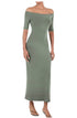 Introducing the Carolyn Off-the-shoulder Jersey Midi Dress by ANEMOS, a sophisticated addition in a serene sage hue. This dress features short sleeves and an elegant off-the-shoulder neckline, perfect for holiday parties. Composition: 94% Cupro, 6% Elastane. Closure: Pull on design. Care: Machine wash and line dry. Ideal for summer occasions, its bodycon silhouette offers a flattering fit.