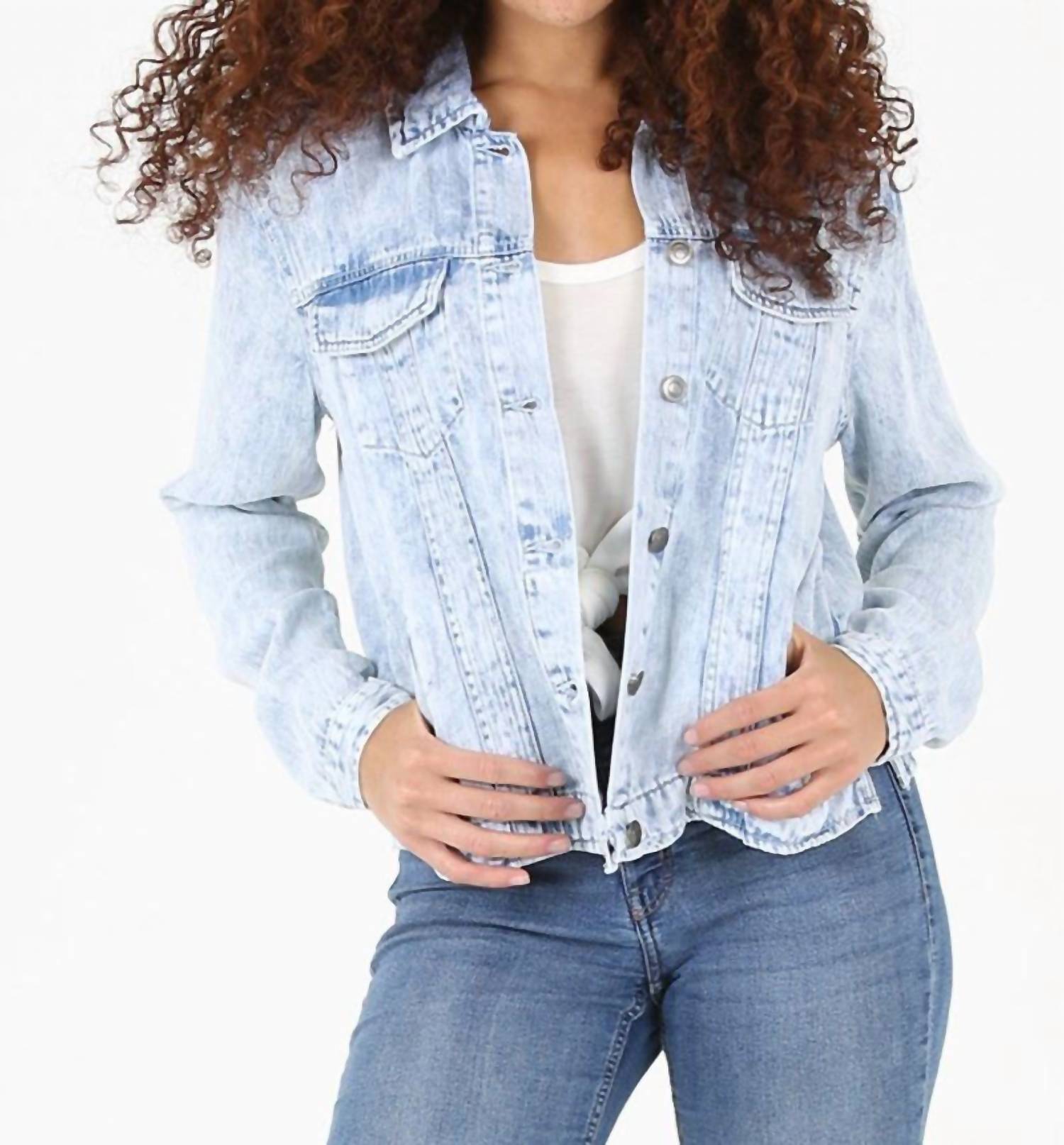 Classic, cool and works with almost any outfit choice. Introducing the Aurora Acid Washed Denim Jacket by ANGIE—a must-have for the warmer seasons. With three-quarter sleeves, this women's jacket offers a perfect blend of softness and a lightweight feel, achieved through its denim composition. Designed with button closure and practical pockets, it's as comfortable as a shirt and stylish as a jacket. Care is made easy with machine wash instructions; this versatile piece is perfect for your travel and streetwear needs.
