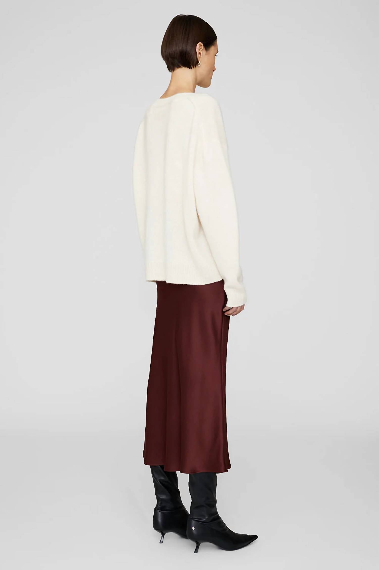 Experience luxe elegance with the ANINE BING Bar Silk Midi Skirt in a rich Dark Cherry hue. Crafted from 25 mm double-faced silk charmeuse, this high-waisted midi skirt is designed with a flattering bias cut that embraces your curves through the hips. Made for comfort and ease, it features an elasticated waistband for a simple pull-on closure. Care: Dry clean only.