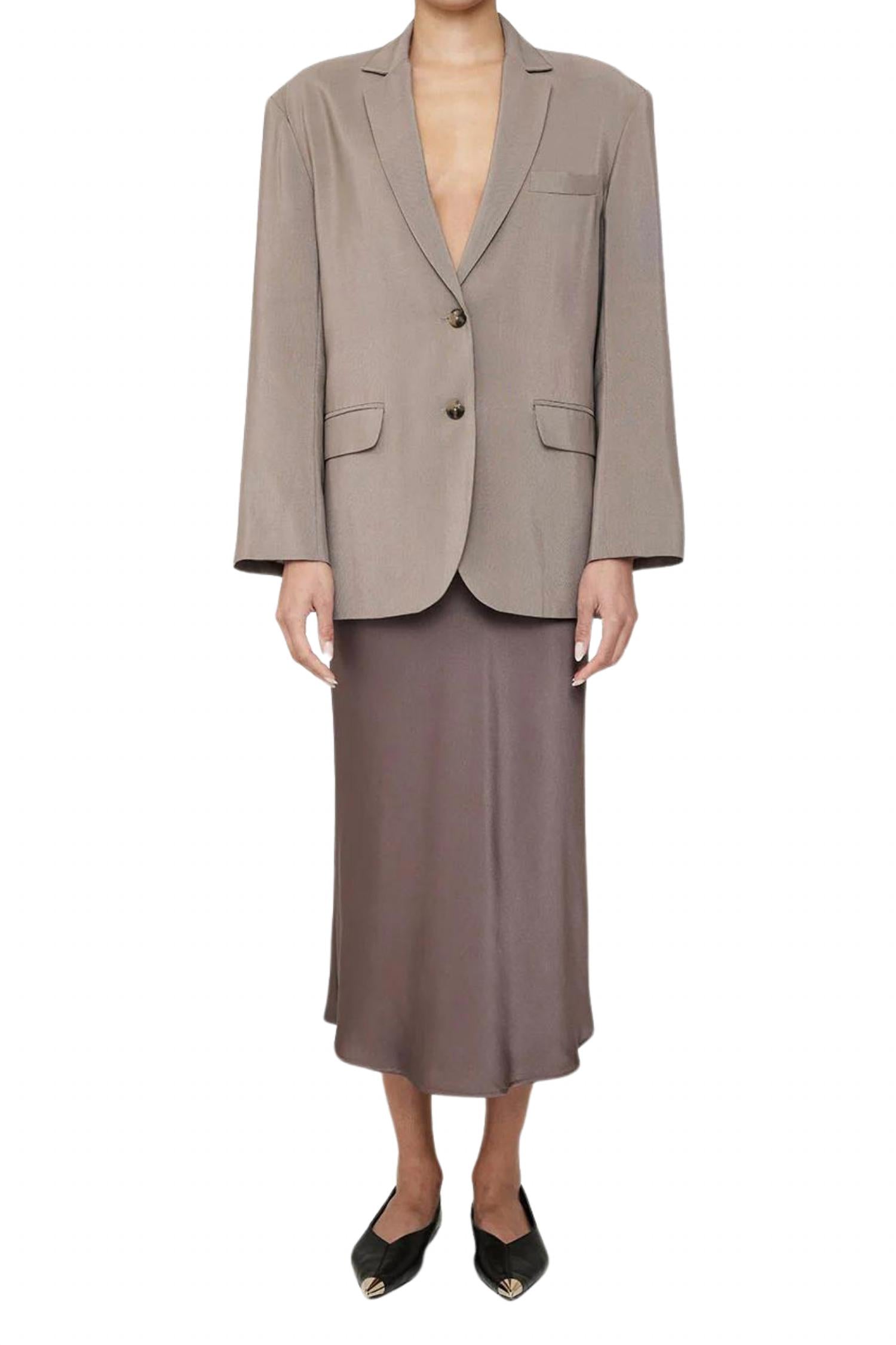 The midi length skirt is here to stay and we especially love this style. Embrace understated elegance with the ANINE BING Bar Silk Skirt in a sophisticated Iron hue. This women's midi skirt is crafted from 100% silk, offering a luxurious feel and a stylish solid pattern. With a convenient zip closure, it ensures a tailored fit perfect for dinner parties and spring occasions. Care is easy with dry clean instructions, embodying the quiet luxury trend.