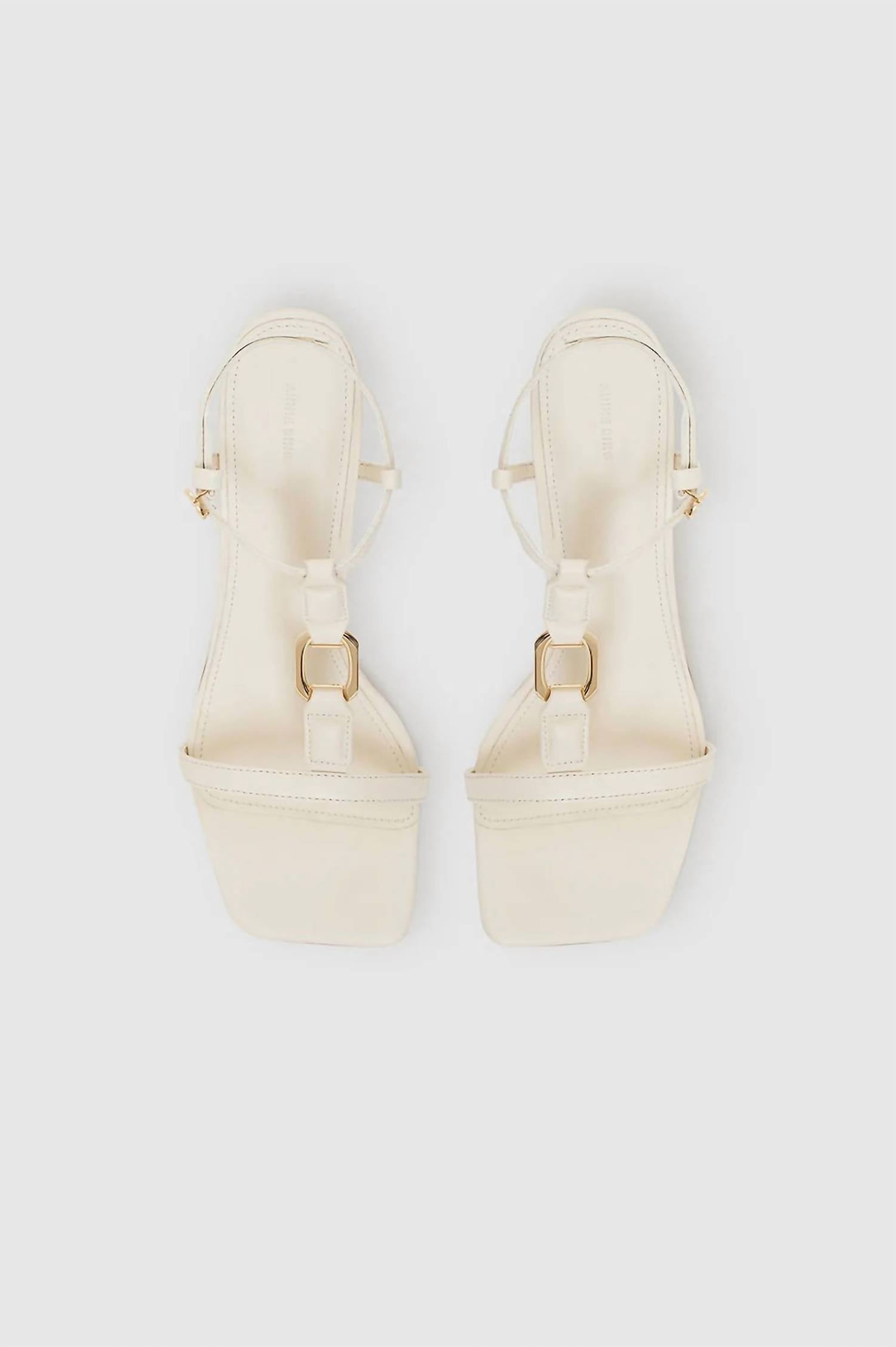 Introducing the Women's Kiera Sandals by ANINE BING, a sophisticated addition to your footwear collection that transitions effortlessly from day to night. These sandals feature a smooth 100% lamb leather construction in ivory with a modern square toe and signature link center strap. The design is completed with an ANINE BING monogram buckle in gold-tone hardware and a mid, kitten heel measuring at 2.6 inches. Made in Portugal with care instructions for spot cleaning, these sandals are ideal for a cocktail party or Mother’s Day occasion. Product Measurements (Size 37): Heel Height: 2.6", Sole Length: 7.8", Sole Width: 3.4".