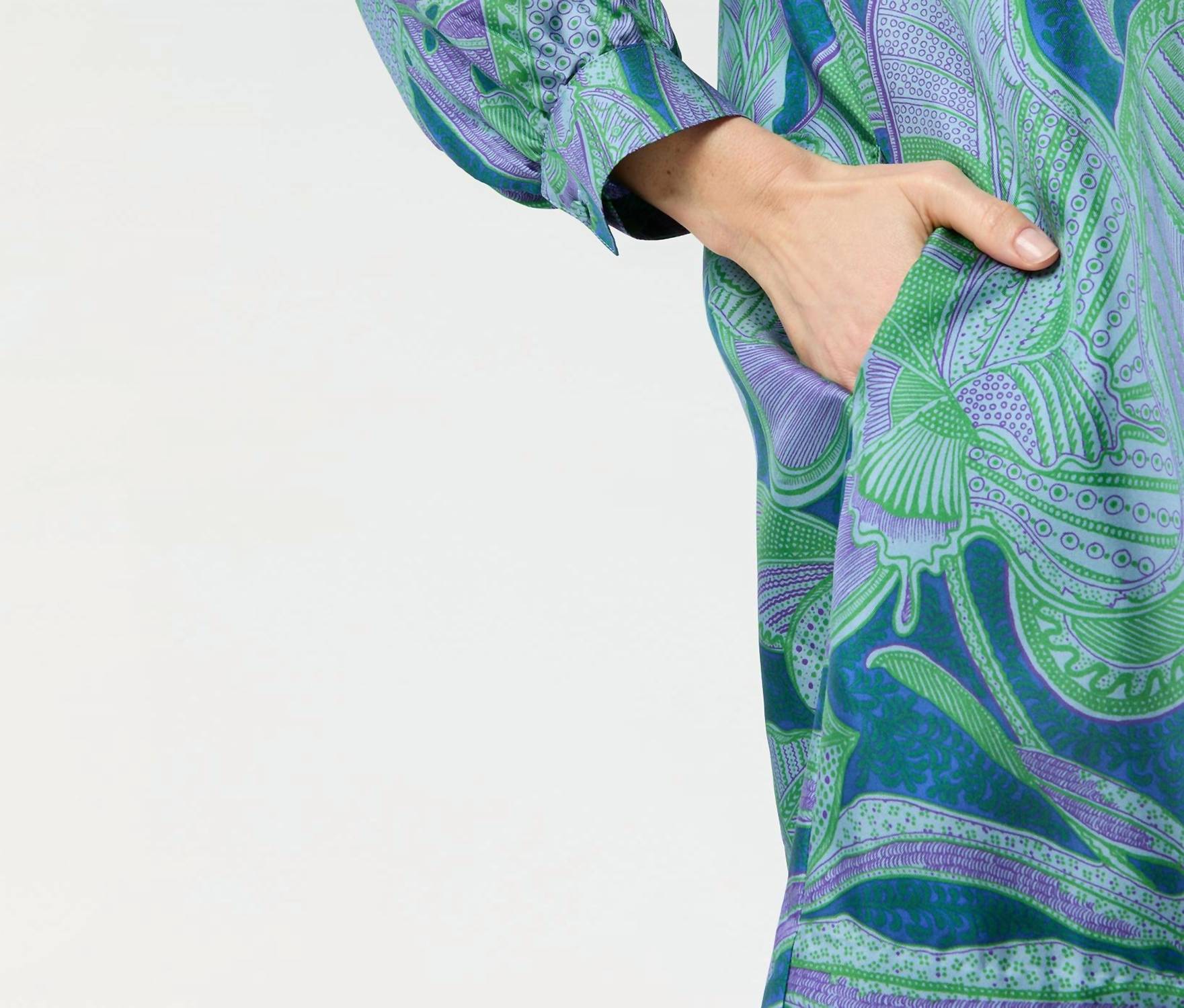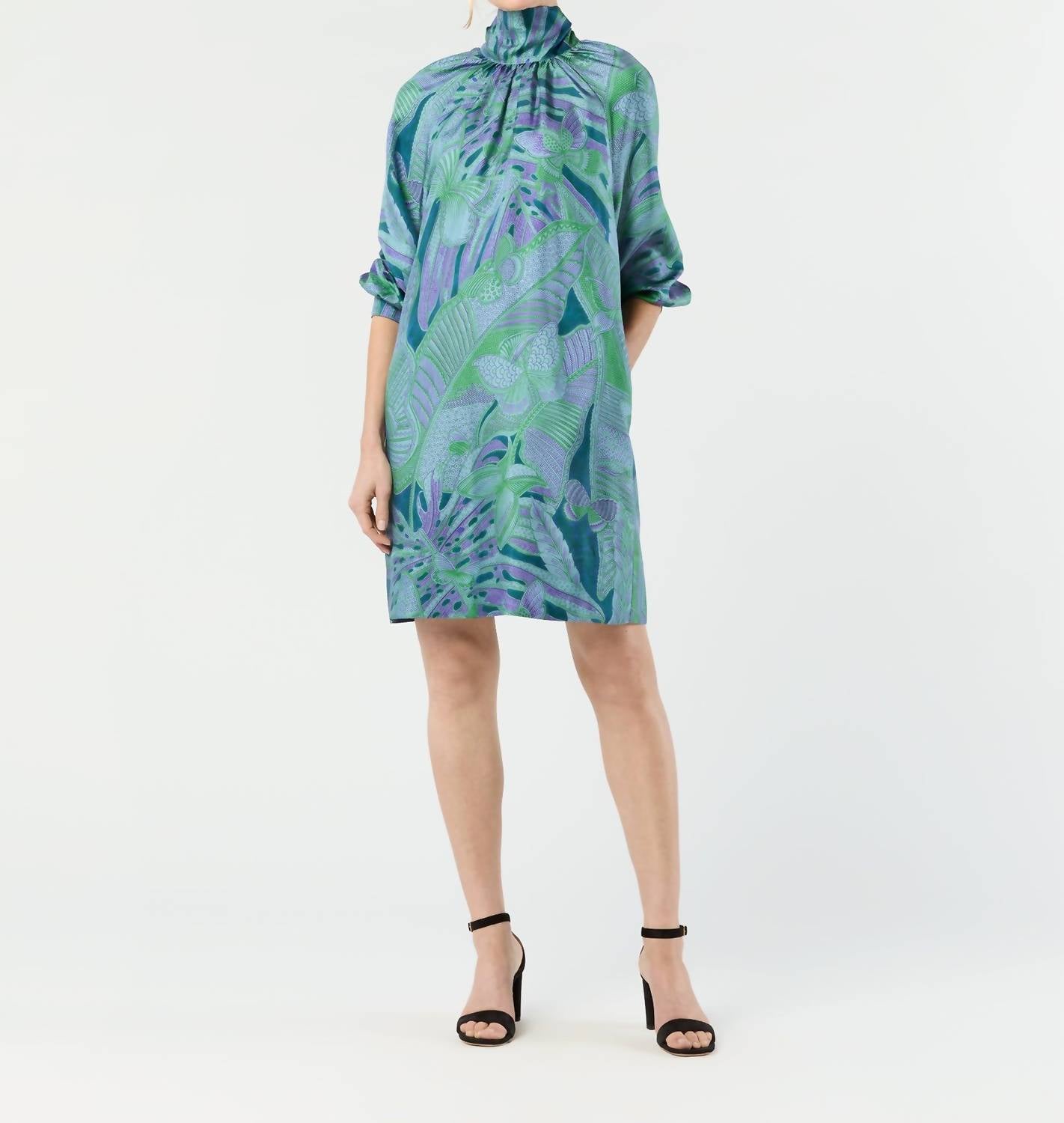 Introducing the Maggie Dress by Ann Mashburn, a boho-chic piece perfect for your next holiday party. Crafted from 100% Italian silk twill in vibrant purple and green, this mini dress boasts a mock neckline and elegant gathers at the neckline and full sleeves with button cuffs. Designed with an oversized tie closure at the back and practical on-seam side pockets, it combines style and convenience effortlessly. Made in China, this dress is available in a shift silhouette and must be dry cleaned, with low iron care recommended. Model is 5'9" and wears a size S.
