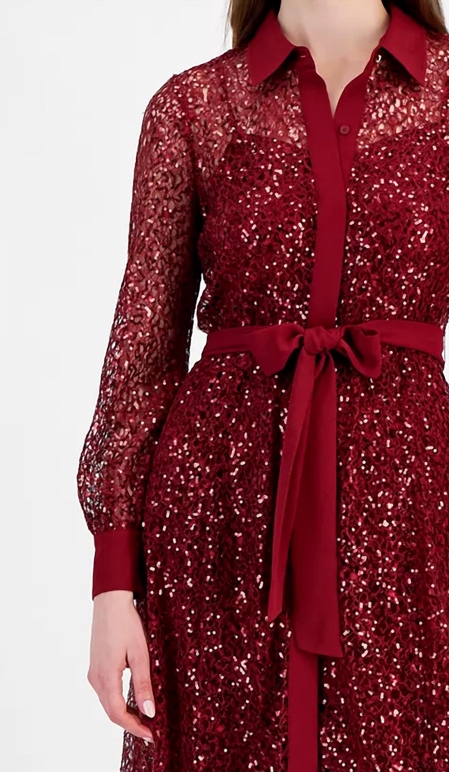Elevate your evening attire with the Anne Klein Button-front Tie-waist Cabernet Dress in a rich wine hue. This women’s long sleeve shirt dress perfectly captures quiet luxury, featuring a textured polyester construction that adds a sophisticated sparkle. Length: Midi. Closure: Button closure. Designed for evening events, it boasts a tailored tie-waist and collar neckline, best maintained through dry cleaning. Ideal for winter festivities like Christmas, without the addition of pockets.