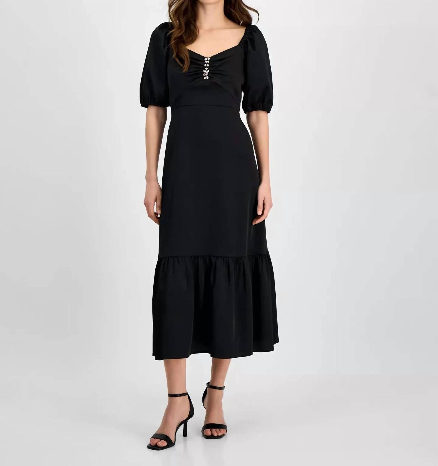 The Rhinestone Puff-sleeve Dress by ANNE KLEIN is an elegant choice for any spring vacation, featuring short sleeves and a flattering V-neckline. Crafted from polyester in a timeless black hue, this minimalist sheath midi dress offers sophistication with its chic rhinestone accents. It boasts a secure zip closure for ease of wear. Care is simple with dry clean instructions, ensuring it remains pristine for any occasion.