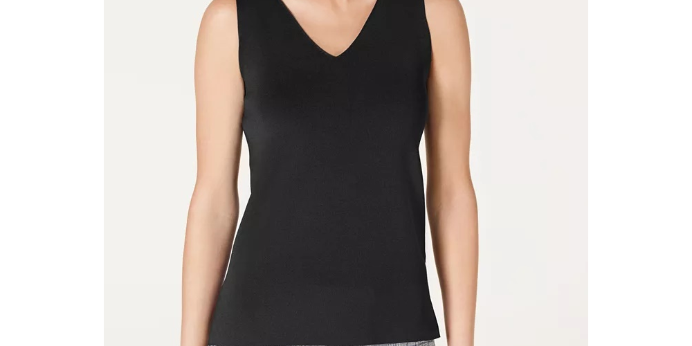 Regata feminina Anne Klein com decote em V canelado, preta, tamanho médio