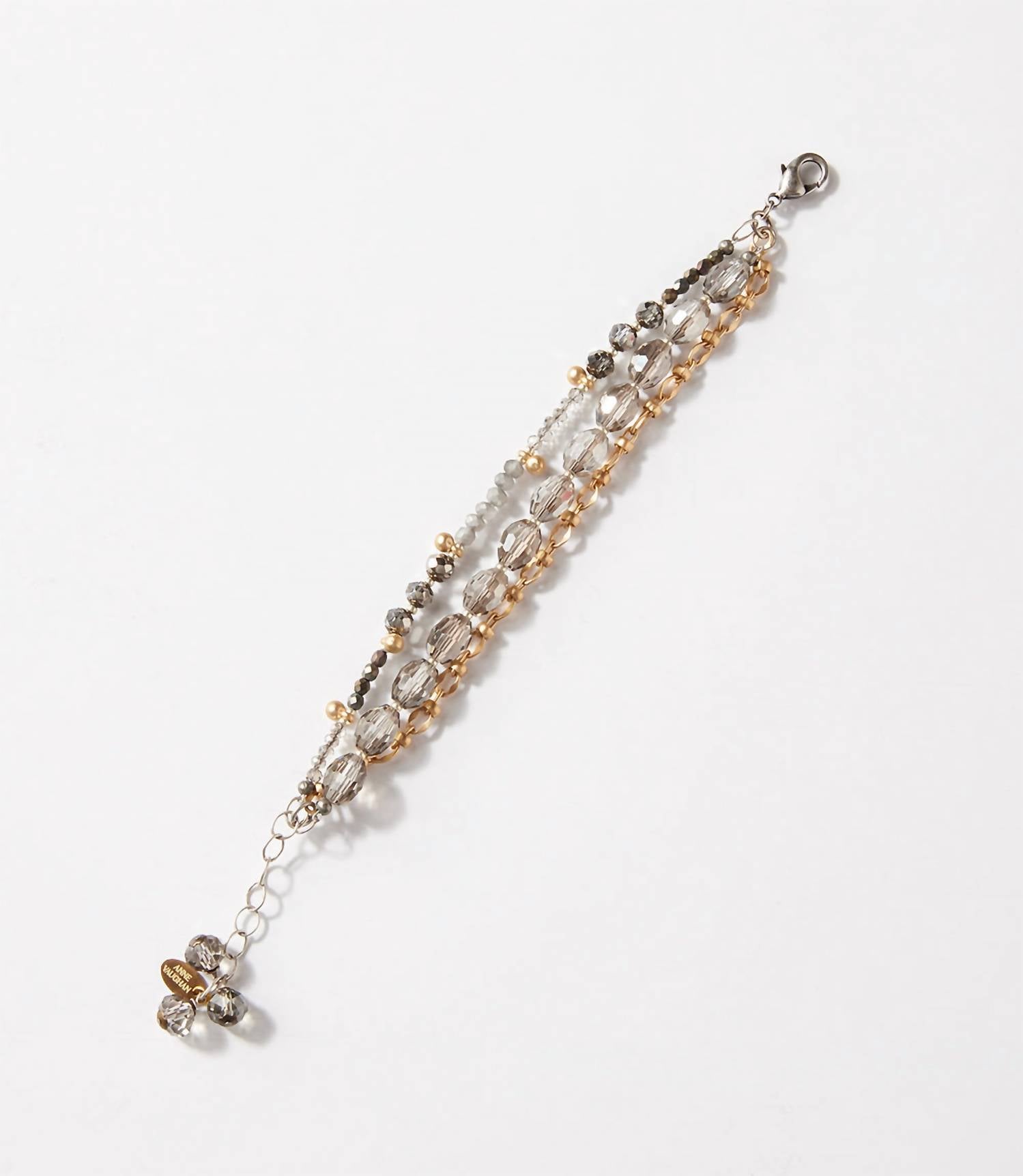 Apresentamos a Pulseira Feminina Multistrand Crystal da Anne Vaughan, uma peça cativante projetada para adicionar elegância a qualquer visual. Esta pulseira apresenta três fios de quartzo fumê, cristais cinza e um elo de corrente dourado, criando um efeito de camadas deslumbrante. Fabricada nos EUA, mede 18 cm de comprimento com um extensor de 2,5 cm e pesa apenas 20 g. Perfeita para realçar seu visual com um toque de brilho sem esforço.