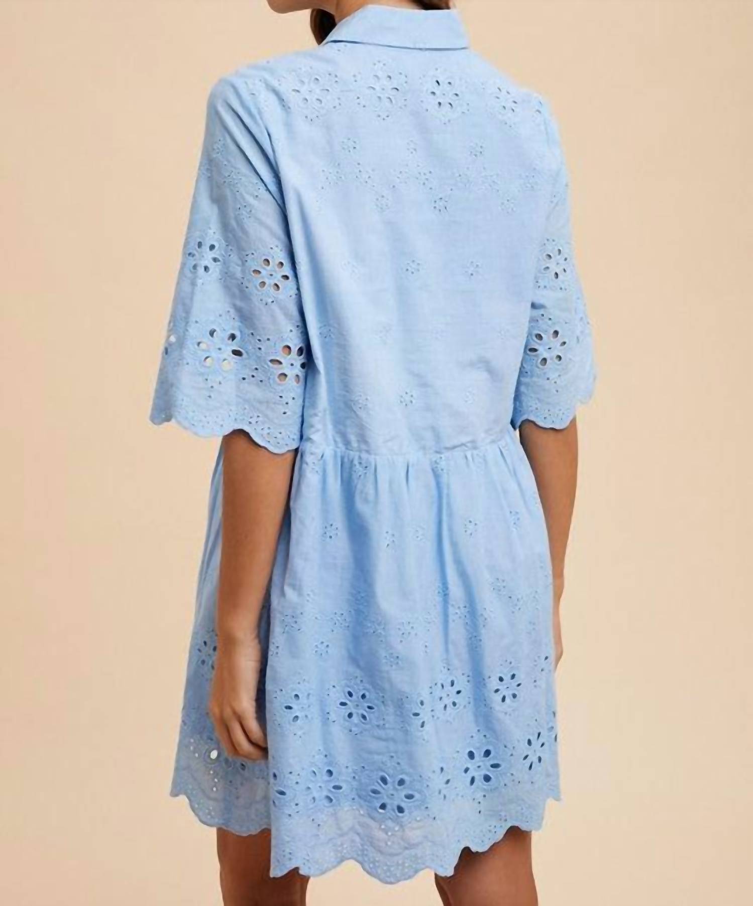 The Dina Embroidered Scallop Edge Mini Dress by AnnieWear is the perfect addition to your spring wardrobe with its beautiful blue hue. Featuring short sleeves and crafted from 100% cotton, this textured shirt dress offers a flattering babydoll silhouette with a button closure. The eyelet embroidery and scalloped hems add a feminine touch to this mini dress. While care instructions aren't specified, it is easy to pair with your favorite accessories for any occasion.