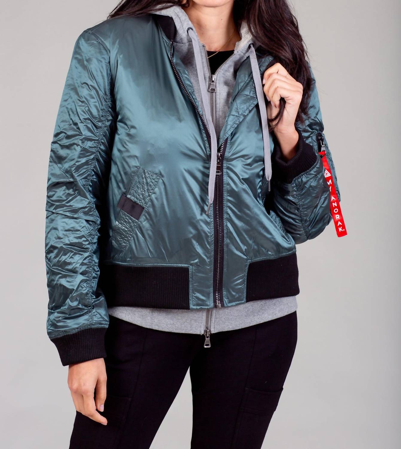 Introducing the 2fer Bomber Jacket by ANORAK in the standout Kryptonite hue, designed for the modern woman. This long sleeve bomber combines 100% water-resistant nylon with a hooded insert, ensuring comfort and practicality. The jacket features a quilted light poly fill interior, knit waistband, cuffs, and collar, complete with a zipper closure and multiple pockets for utility. Easy care: Machine wash and tumble dry for effortless maintenance.