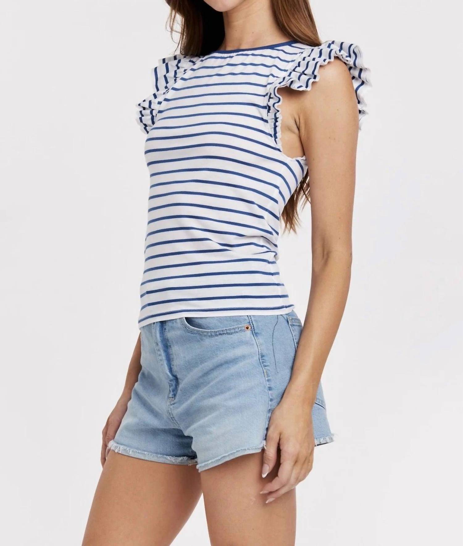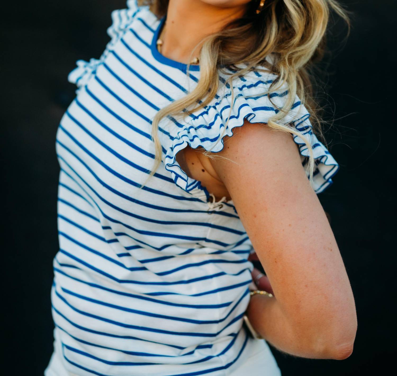 Uma blusa versátil que pode ser usada do escritório ao jantar! Abrace a elegância atemporal com o Top Akiko Listrado com Gola Canoa da Another Love, perfeito para looks versáteis de verão e férias. Este top chique apresenta mangas bufantes com babados e um sofisticado decote canoa, tudo adornado com um padrão clássico de listras azul-marinho e branco. Fechamento: Puxe para vestir. Ideal para combinar com jeans ou saias, esta peça transita facilmente do trabalho para o fim de semana.
