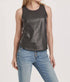 Enhance your wardrobe with the Carmela Mix Media Tank Top by Another Love, perfect for any occasion in a solid Iron Gray. This sleeveless tank features a crewneck with armhole bands and a neckline in vegan leather, creating a trendy look. Made from a cotton blend, the body consists of 40% Polyurethane, 30% Cotton, and 30% Polyester, with contrast in 95% Rayon and 5% Spandex. It measures 22" in body length and 35" in bust for size small and is imported. Closure: Pull on.