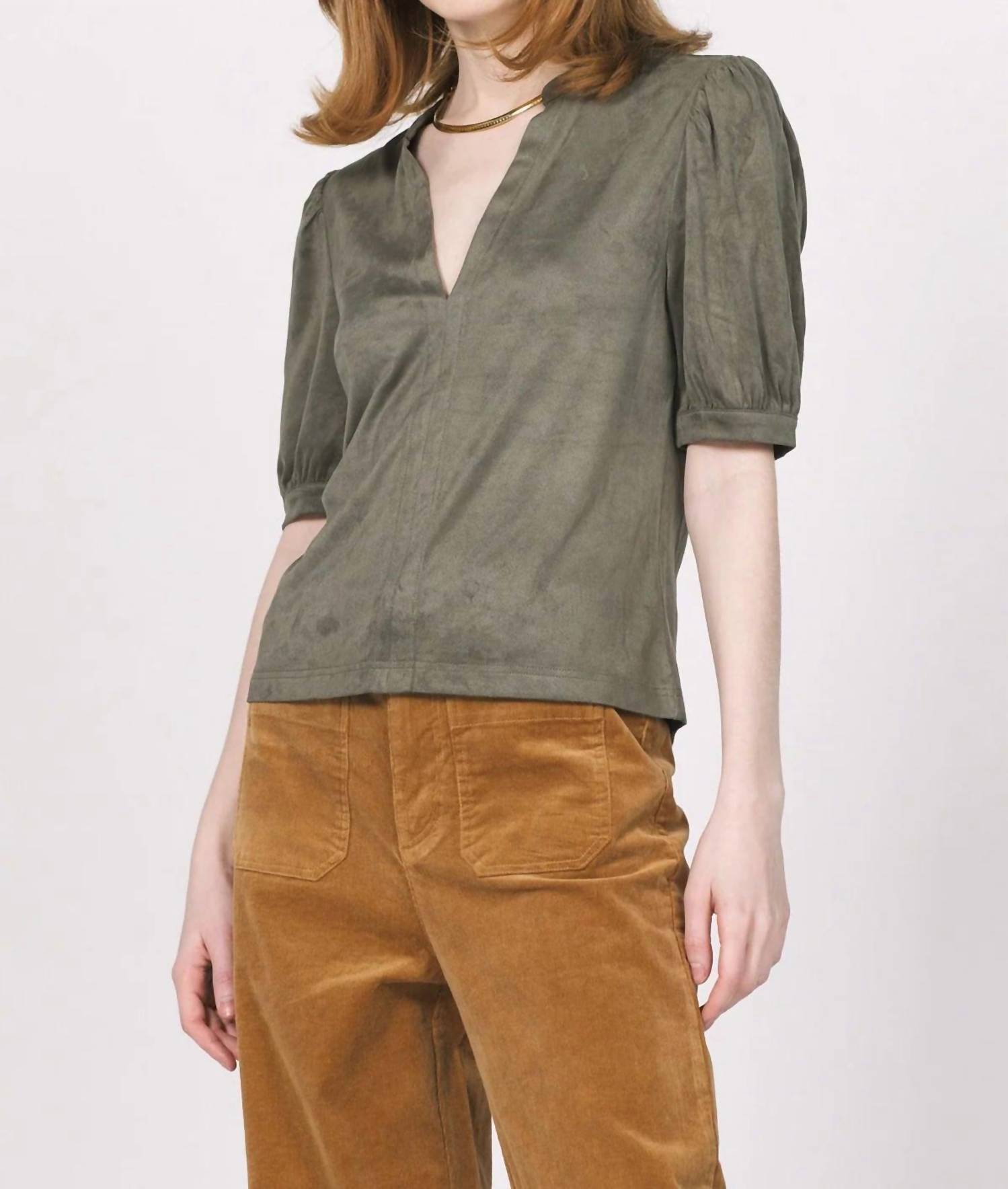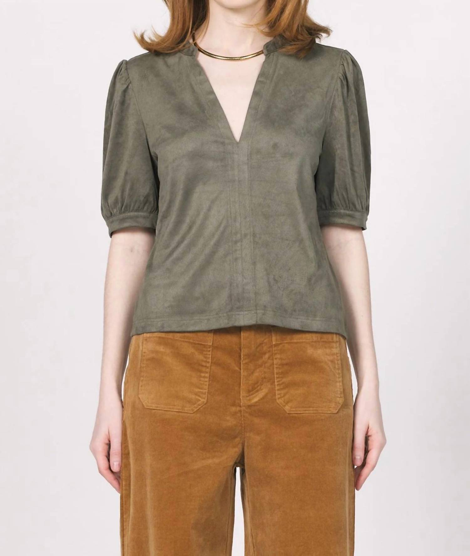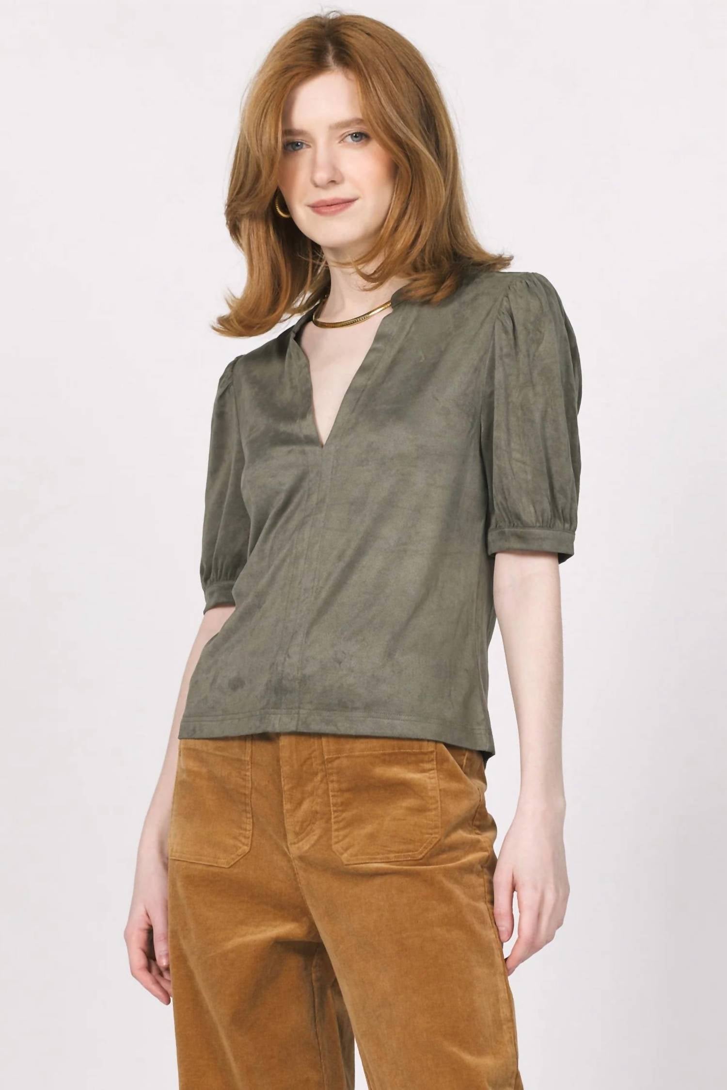 The Kalia Suede Top by Another Love is a sophisticated addition to any wardrobe, featuring short puff sleeves and a chic V-neckline in a rich Olive Brown color. This solid-patterned blouse is crafted from 92% Polyester and 8% Spandex, ensuring both comfort and a flattering classic fit. With a pull-on design and a body length from HPS of 22", it provides an effortless blend of elegance and modernity. Care for this versatile piece by hand washing cold, turning it inside out, and drying flat.