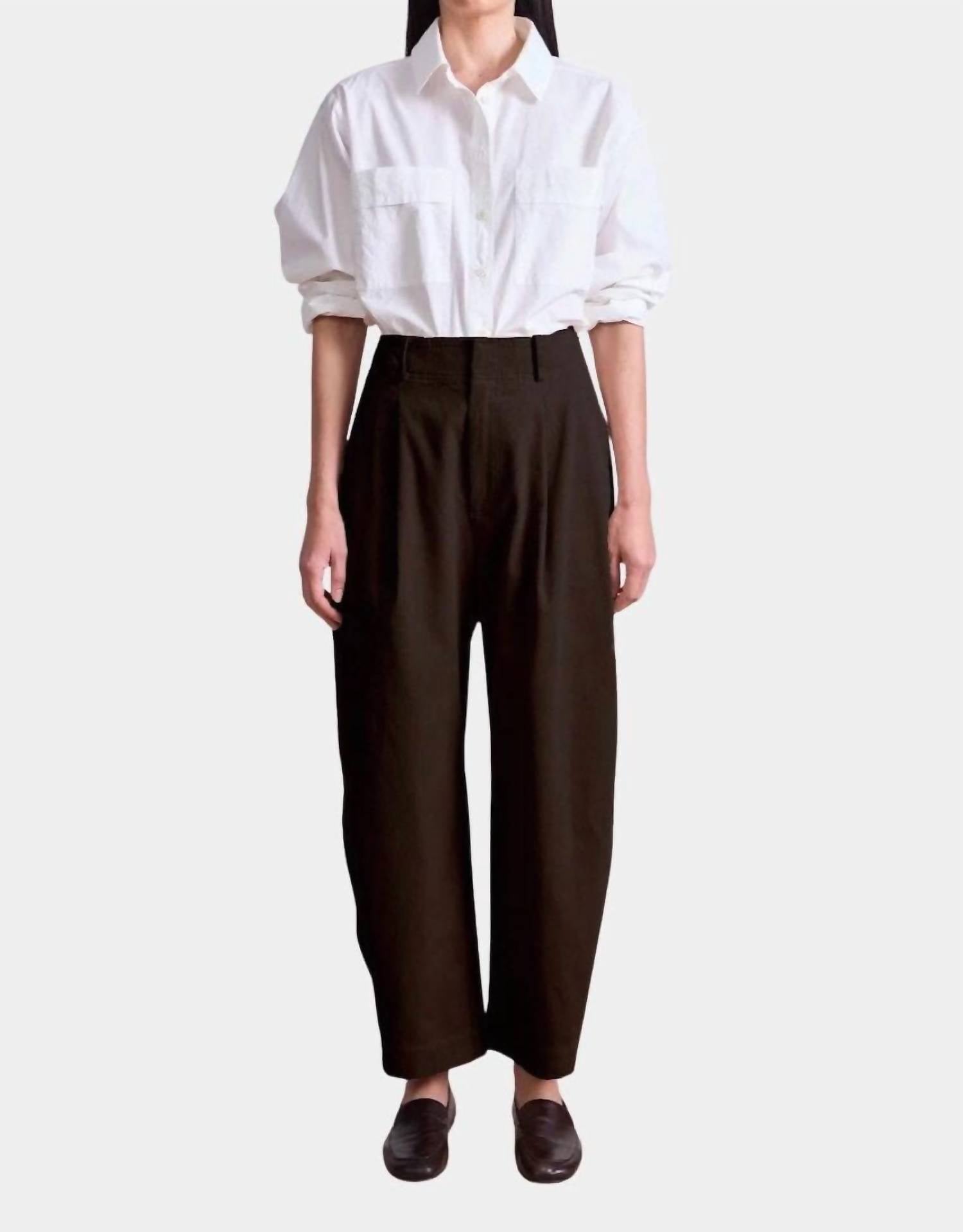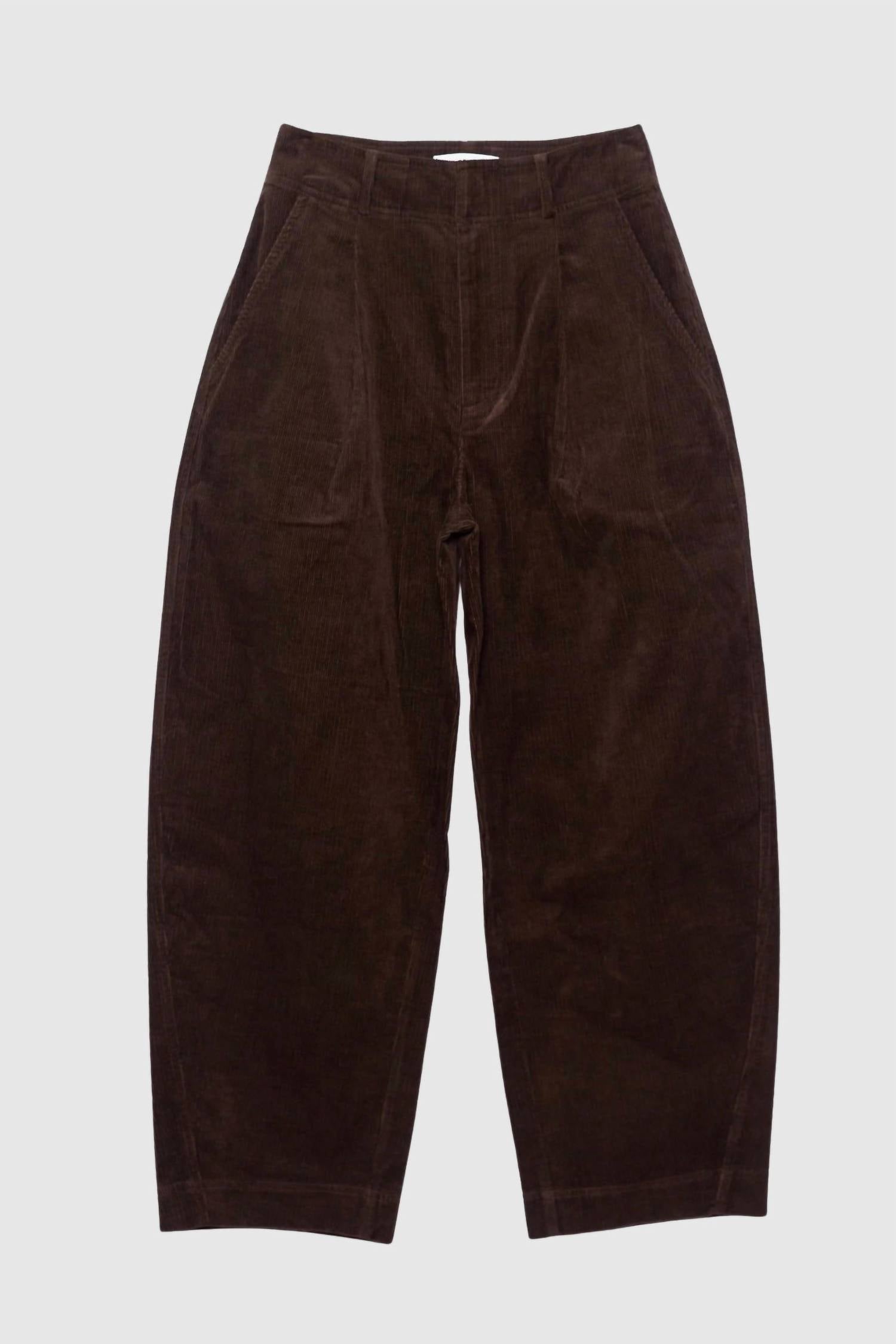 Discover the Bari Crop Corduroy Trouser in Carob by APIECE APART, effortlessly merging relaxed comfort with polish. These high-waisted trousers feature a wide barrel leg and are made from mid-weight, non-stretch 100% cotton corduroy. They come complete with a pleated front, slash hip pockets, and welt back pockets, all secured by a hook and bar closure. Made in China, these trousers recommend dry cleaning or a gentle cold machine wash with flat drying for best care. Model is 5'10" and wears size 4.