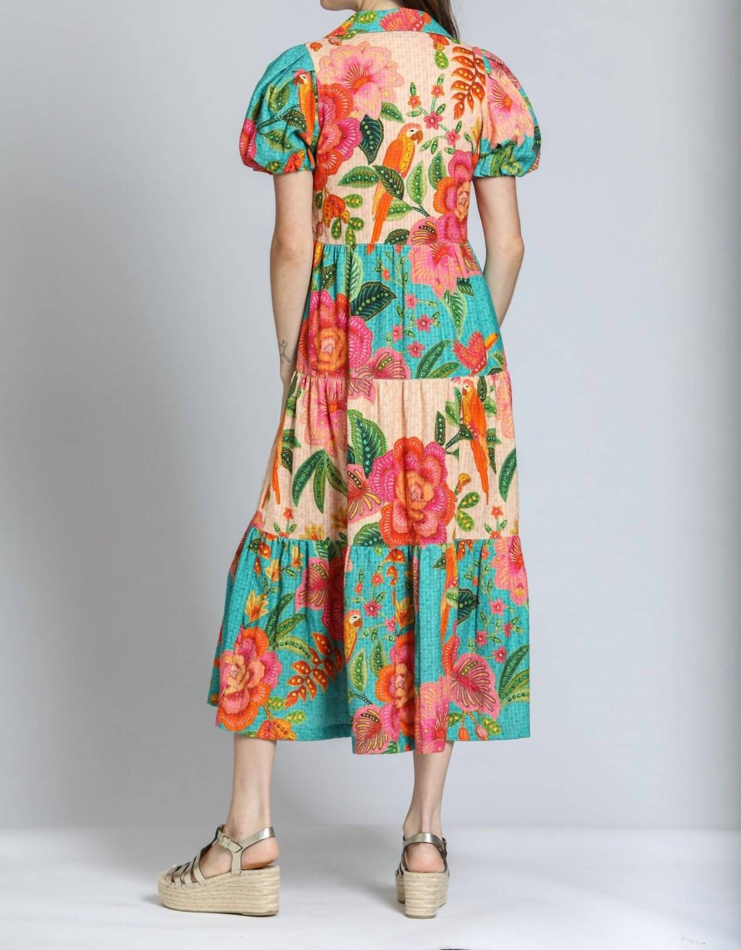 Elegant boho chic option for your wardrobe. Features puff short sleeves and is crafted from 100% cotton, providing a breathable and lightweight feel. With a flowing silhouette that falls mid-calf and a button-front closure, perfect for sunny days and holiday parties alike. Care for this vibrant turquoise multi floral design with a machine wash on a gentle cycle and line dry. Model is 5'9" and wearing a size Small.