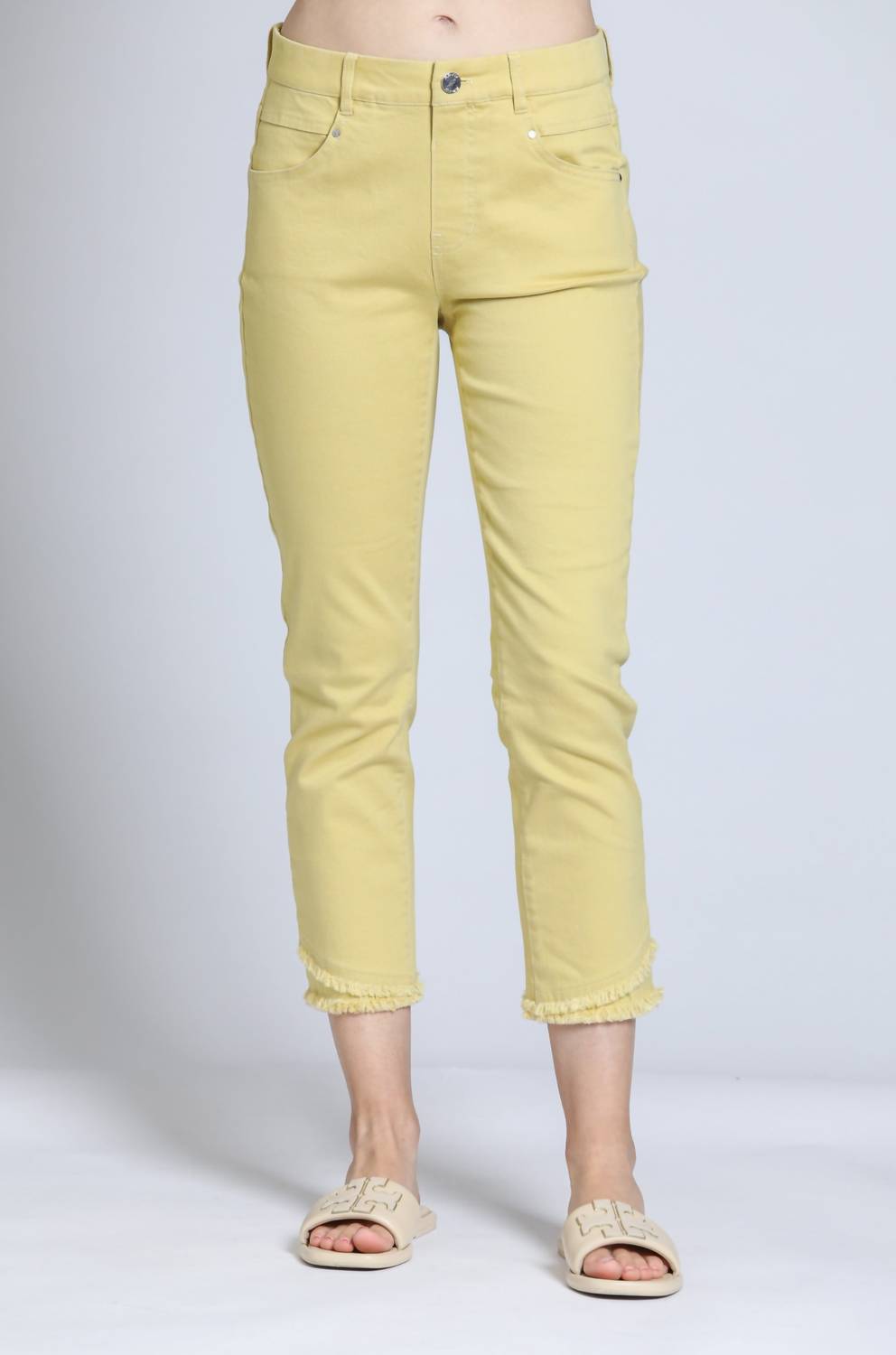 Esses jeans indispensáveis ​​têm um caimento perfeito. Apresentamos a Calça Jeans Olivia Pull-On Crop Desfiada da APNY, a sua escolha para um look descontraído e ousado. Desenhada num elegante tom Lemon Drop, esta calça jeans apresenta um design confortável com fecho de botão funcional, passadores de cinto e práticos bolsos laterais e traseiros. Com corte reto e bainhas desfiadas divertidas, oferece um toque minimalista e rebelde, perfeito para a primavera e ocasiões de férias. Confeccionada com uma mistura de algodão 98% algodão e 2% elastano, é lavável à máquina para facilitar a manutenção. O estilo cropped oferece uma costura interna de 63 cm e recomenda-se um tamanho maior para um ajuste mais confortável. A modelo tem 1,75 m e veste tamanho 4.