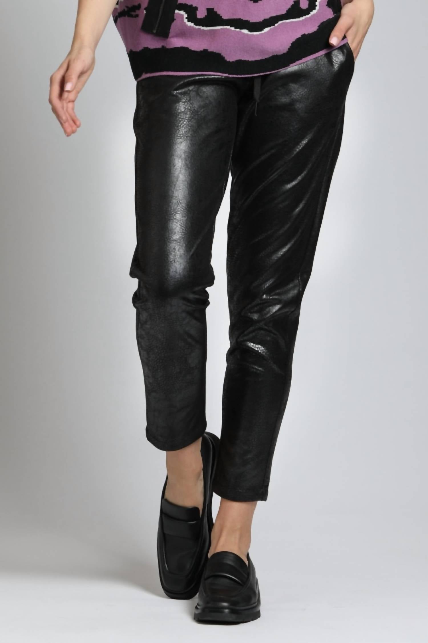 Everyone needs a good pair of skinny pants and this is a style you'll keep reaching for no matter the season. Elevate your style with the Textured Vegan Leather Jogger by APNY, a must-have piece for your fall wardrobe. Crafted from sleek black faux leather, these joggers offer a solid, slim fit with a trendy skinny leg for a sleek silhouette. Designed for convenience with a pull-on closure and pockets, they're perfect for occasions like concerts or Thanksgiving gatherings. Care instructions are simple, machine wash and tumble dry for easy maintenance.