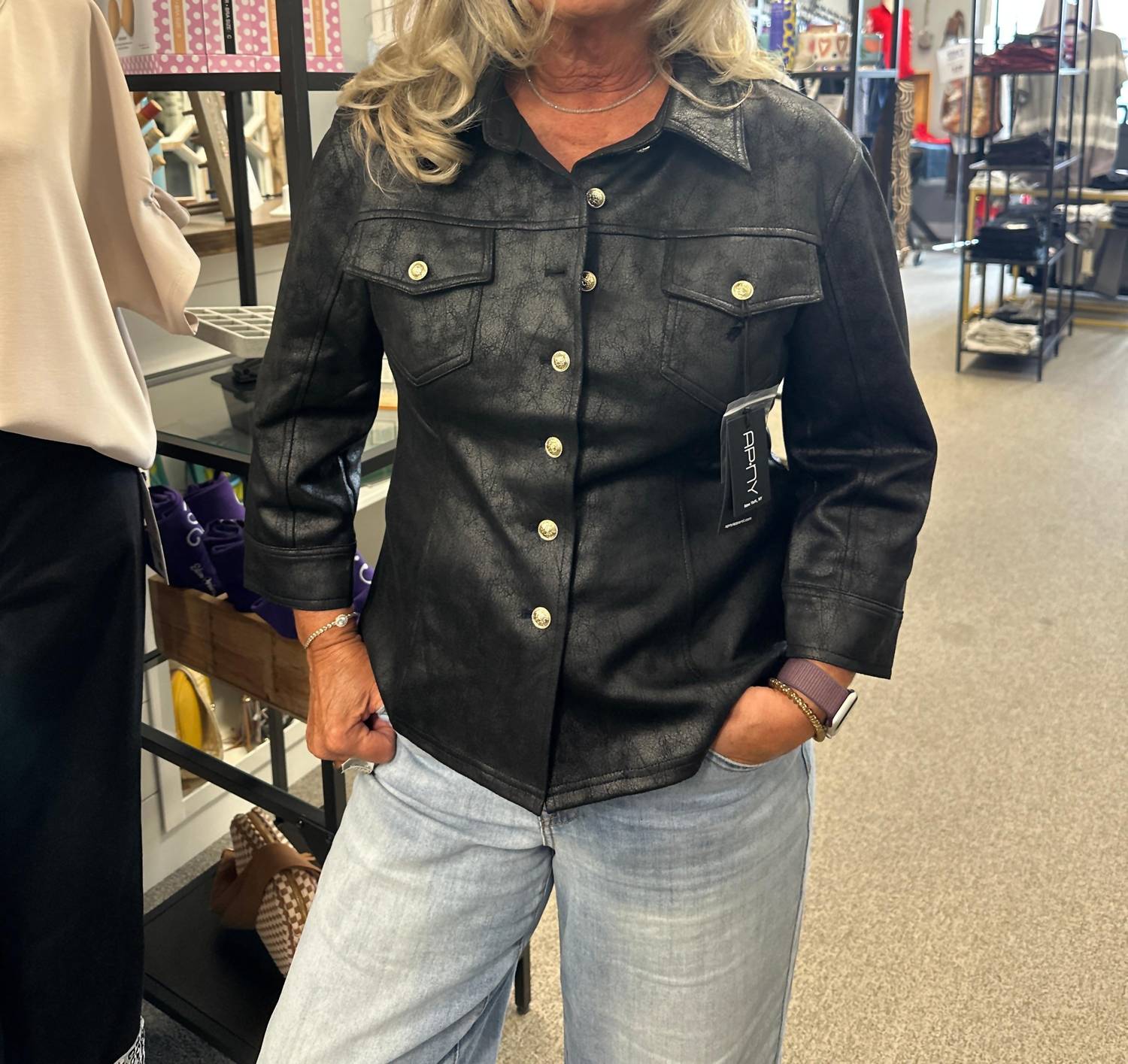 Introducing the APNY Vegan Shirt Jacket, an elegant piece in solid black designed to elevate your wardrobe with structure and sophistication. Crafted from 92% polyester and 8% spandex, this long sleeve jacket features a button closure with a V-neckline and shirt collar. The flap chest pockets add both style and practicality, while the straight hemline offers versatile styling options. Care: Hand wash and lay flat to dry.