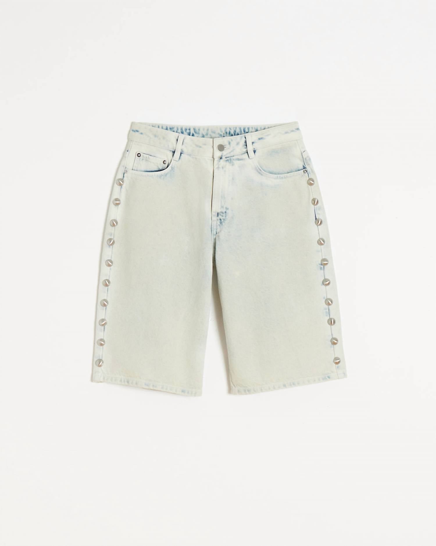 Discover the ultimate warm-weather essential with these stylish women's Bermuda shorts, skillfully crafted to provide a harmonious fusion of fashion and function. Elevate your summer wardrobe with the Button Faded Denim Bermuda Shorts by APPARIS, crafted from 100% cotton for a comfortable fit. These light blue shorts feature a mid-rise silhouette and a relaxed fit with brushed silver dome stud embellishments. Designed with a practical five-pocket style, they close with a zipper fly and a brushed silver shank button. With a 13-inch inseam, these shorts are machine washable, offering both style and convenience. Model is 5'10" and wearing a size small.