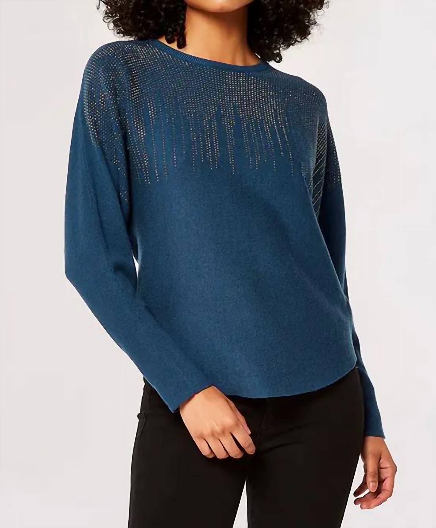 Introducing the Chandelier Stud Batwing Sweater by APRICOT, a chic teal jumper perfect for any wardrobe. This sweater features long raglan sleeves and a collarless, crew neck design with dropped shoulders for a relaxed fit. Made from a medium knit with a composition of 52% Viscose, 28% Polyester, and 20% Nylon, it measures approximately 61.5 cm in length. Closure is via a pullover style, and care is straightforward: machine wash on a gentle wool cycle at 30 degrees, do not bleach or tumble dry, and iron on low.