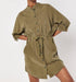 The dress, framed by a grandad collar and 3/4 length rolled sleeves, features dropped shoulders and a drawstring waist for a cinched silhouette, complemented by practical side seam pockets. Comprised of 92% Viscose and 8% Polyester, it measures approximately 88.5cm in length. Closure: Button closure. Care instructions include machine wash. Model wears an XS/UK 8 and stands 5' 10" tall.