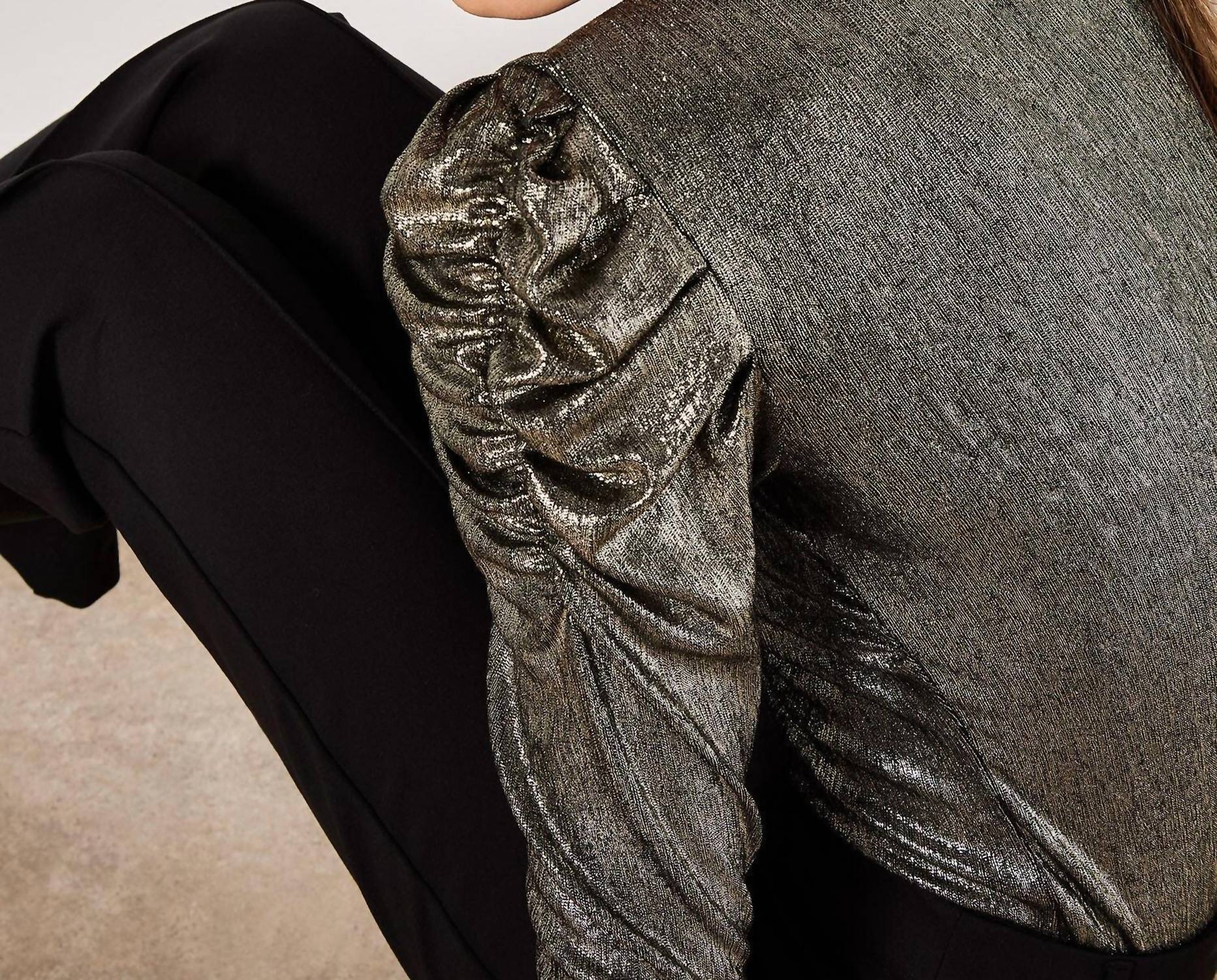 Great fit, cute design, soft fabric. You'll love everything about this long sleeve tee. Elevate your evening attire with the Ruched Sleeve Metallic Top by APRICOT, a dazzling addition to your wardrobe in a radiant gold hue. This women's top boasts long sleeves with ruched puff designs and a fashionable mock neck, complemented by a chic metallic finish. Crafted from 95% polyester and 5% elastane, it ensures a flattering fitted silhouette with a handy hook and eye closure at the neck. Care: Dry clean only. Ideal for dinner parties and a perfect nod to the quiet luxury trend.