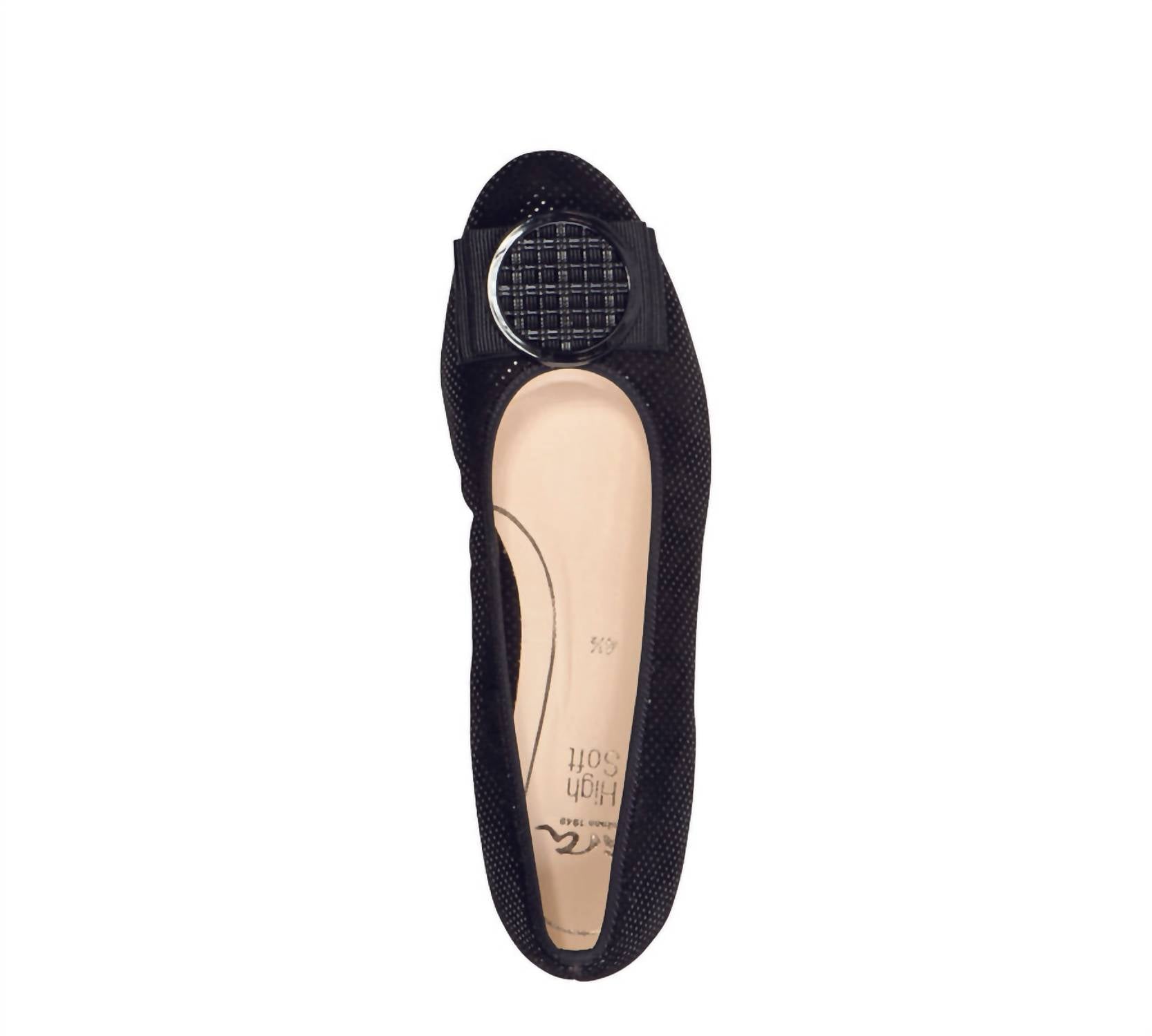 These classic ballet flats feature a soft pin dot suede upper and an elasticized topline for a comfortable, custom fit. Stylish details include a metallic ornament, fabric bow trim, and a rounded toe. Designed with advanced cushioning technology, they’re perfect for day-to-night wear.