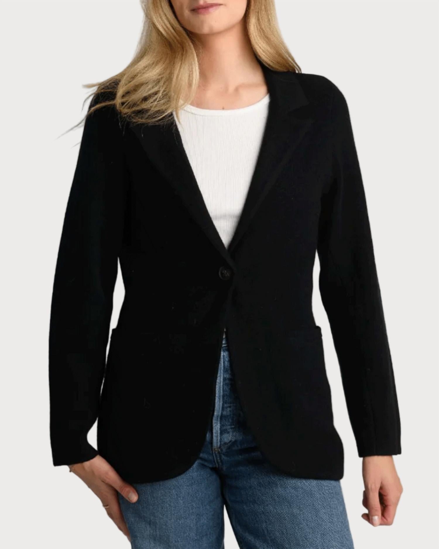 Tailored to perfection, this blazer will be your go-to jacket for years to come. Introducing the Archer Blazer by Archer Cashmere, a timeless piece that embodies understated luxury with its long sleeves and solid black hue. Expertly crafted from 100% cashmere, this blazer features a relaxed fit with a softly structured silhouette that ensures a light yet luxurious feel. The button closure and tailored collar complete its minimalist design, making it a perfect layer for fall occasions like Thanksgiving or a holiday party. Care for this tactile warmth by following the dry clean only instructions.