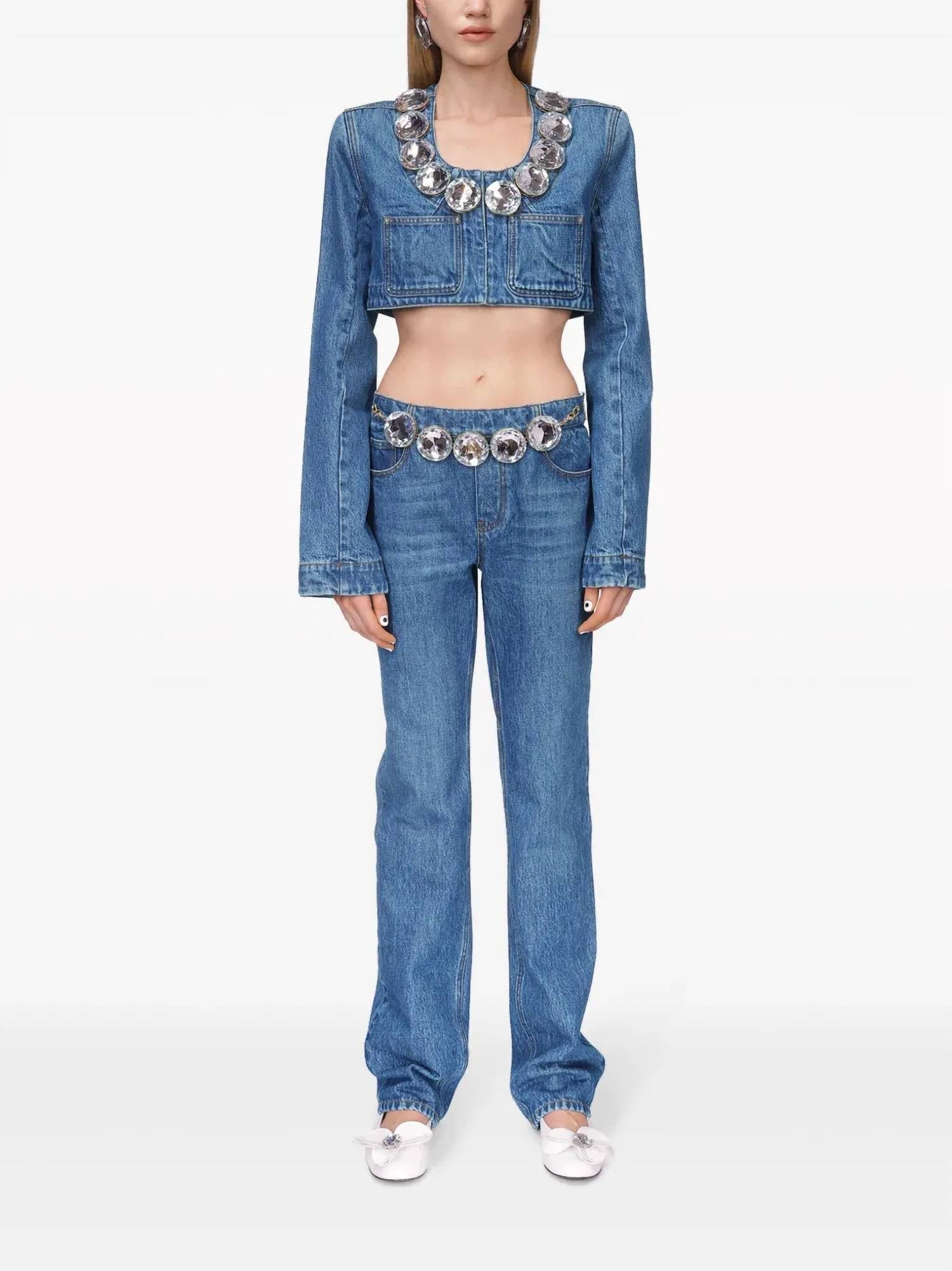 Introducing the Jumbo Crystal Jean by AREA, a sophisticated blend of style and elegance for any vacation look. These women’s denim jeans, crafted from 100% cotton, feature a straight leg design with a regular fit in a chic medium wash. The standout removable jumbo crystal belt and 'AREA' crystal nameplate at the rear pocket add sparkling details to your ensemble. Closure is via zip and fly, with dry clean only care instructions to maintain its pristine appearance.