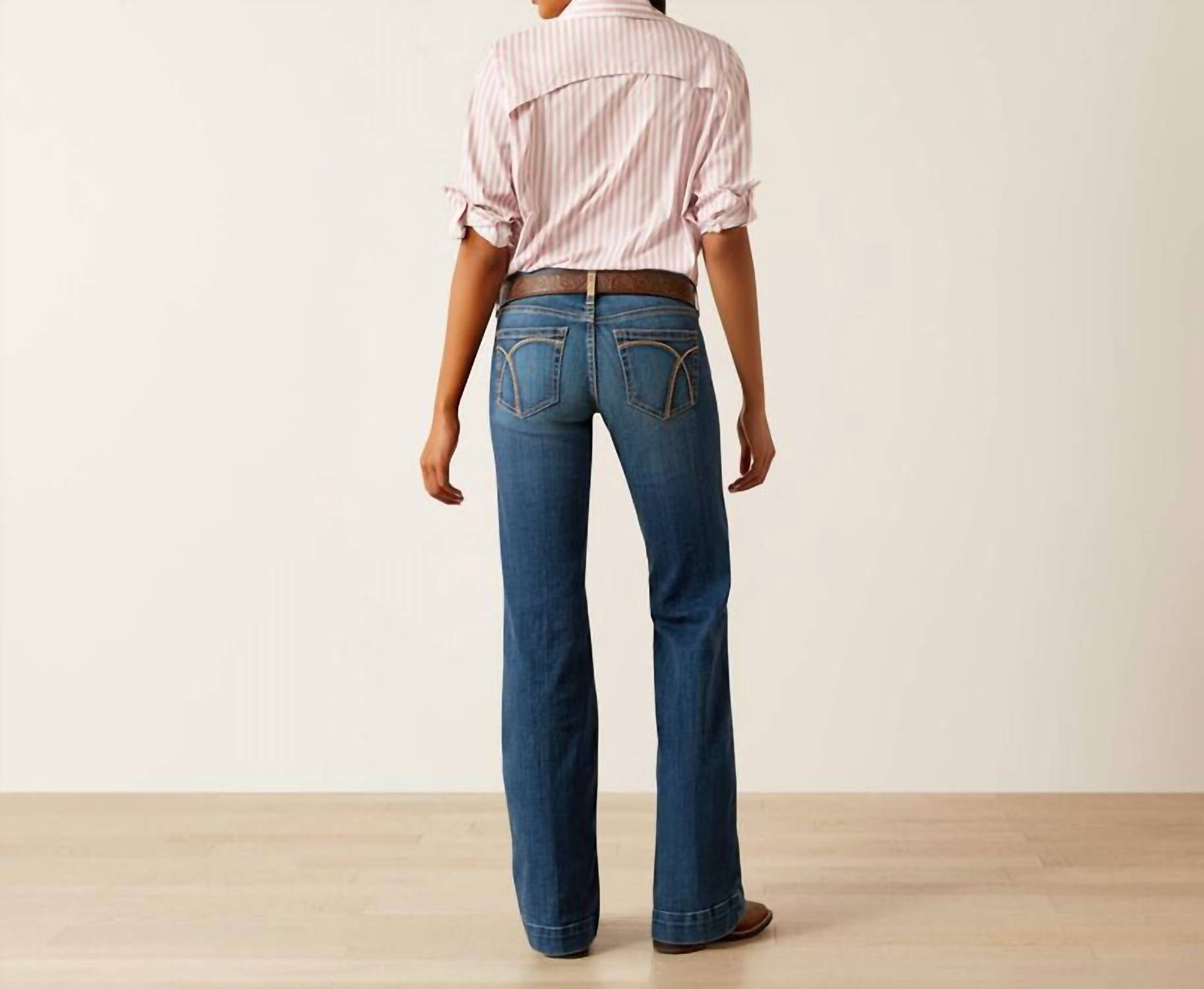 A flattering silhouette that's suprisingly versatile. Introducing the Mid Rise Hasley Slim Trouser Jeans by ARIAT, a must-have for any wardrobe. These versatile jeans in a dark wash feature a stylish flared leg that is 22" wide, perfect for both casual outings and dressier occasions. Made from a premium cotton blend of 82% Cotton, 17% Repreve® Recycled Polyester, and 1% Lycra® Spandex Elastane, they provide comfort and a flexible fit. With an 8.5" mid-rise waist and a button closure, these jeans are designed for women who appreciate style and sustainability.