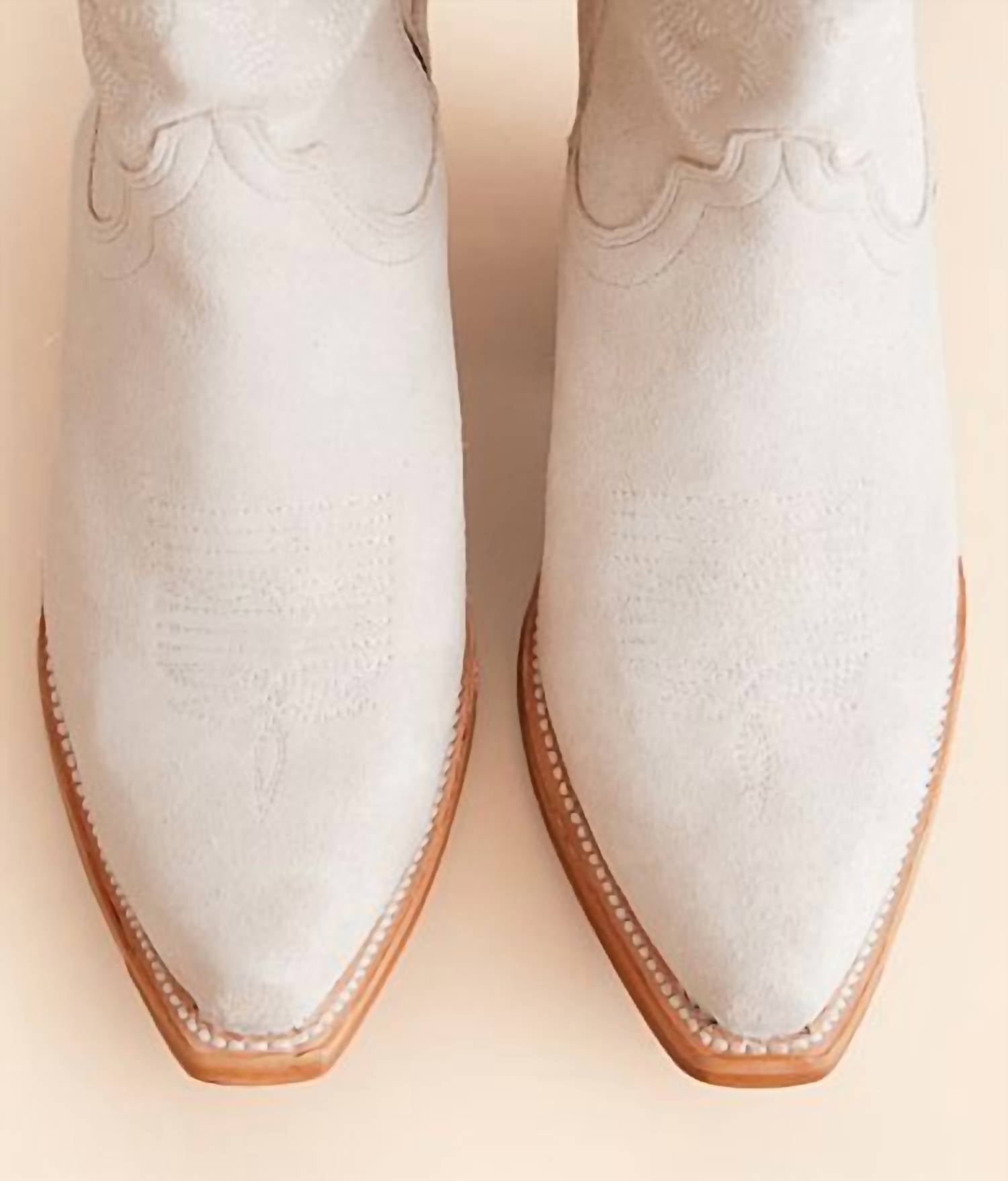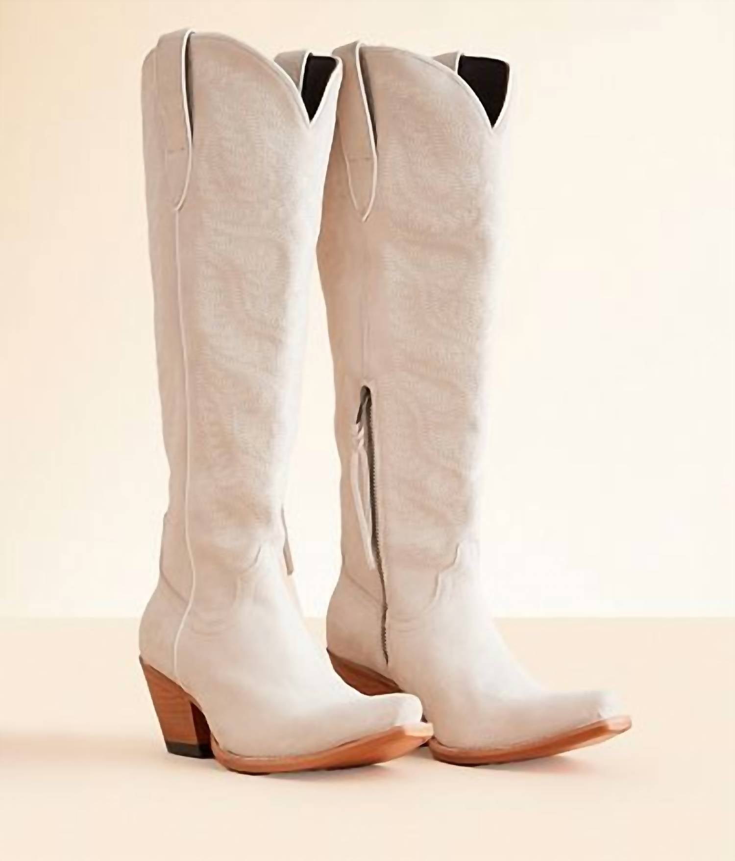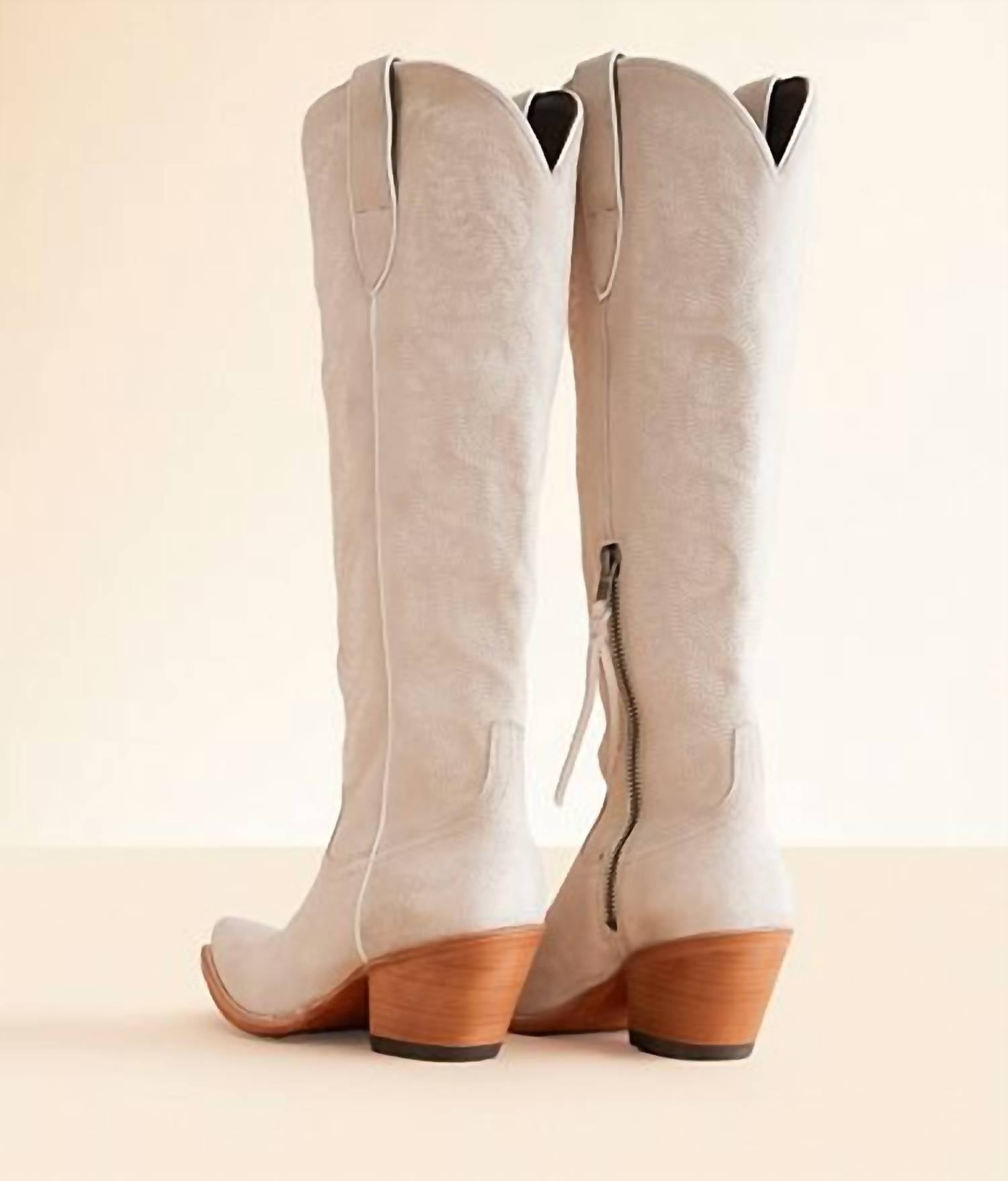 Step into style with the Women's Laramie Stretchfit Leather Western Boots by ARIAT in elegant Oyster Suede. These heeled boots feature an 18" shaft height and a 3" new west heel, designed with a pointed X toe for a chic, Western flair. Crafted from premium suede with a leather lining, they boast the stretchy versatility of StretchFit panels for diverse calf sizes and ergonomic support provided by ATS® technology. The hand-nailed vegetable-tanned leather sole and resoleable Goodyear leather welt construction ensure durability across seasons.