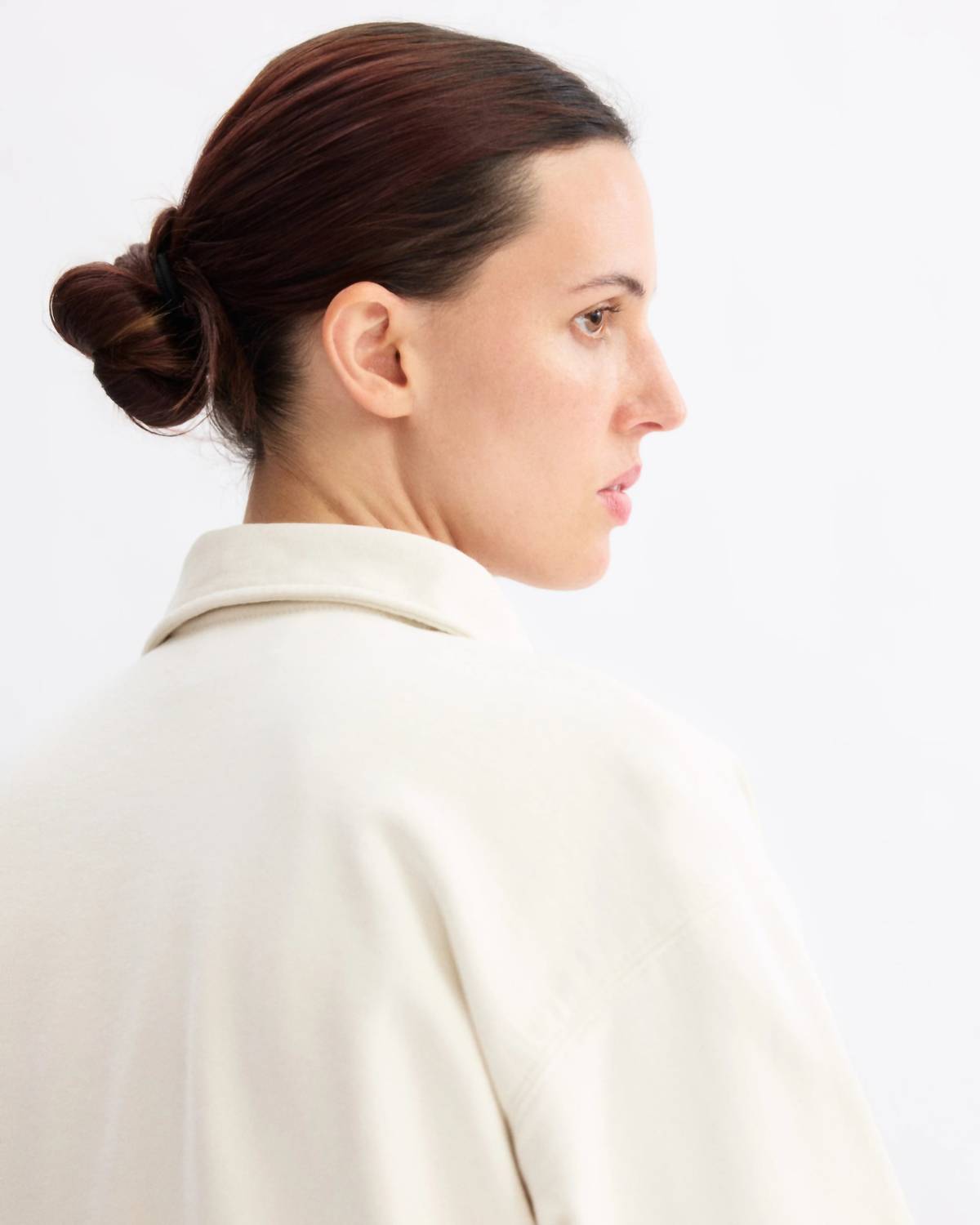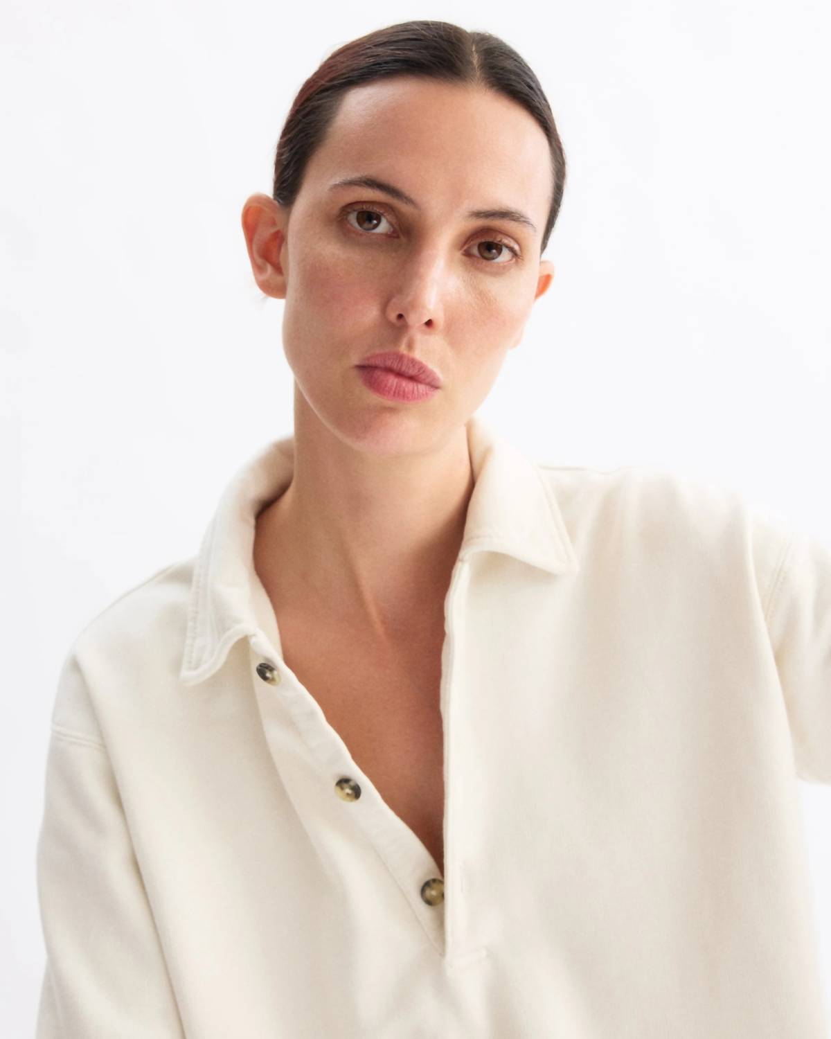 The perfect long sleeve tee that goes with just about anything. Elevate your holiday party style with the Elliot Polo Pullover by Arlo Mott, a refined piece in solid olive. This women's long-sleeve top is crafted from 100% Italian terry cloth, ensuring a structured fit that remains polished. Handmade in New York, it features a button closure and a classic collar neckline. Please refer to the fit details: Model is 5'9" and wears a size small.