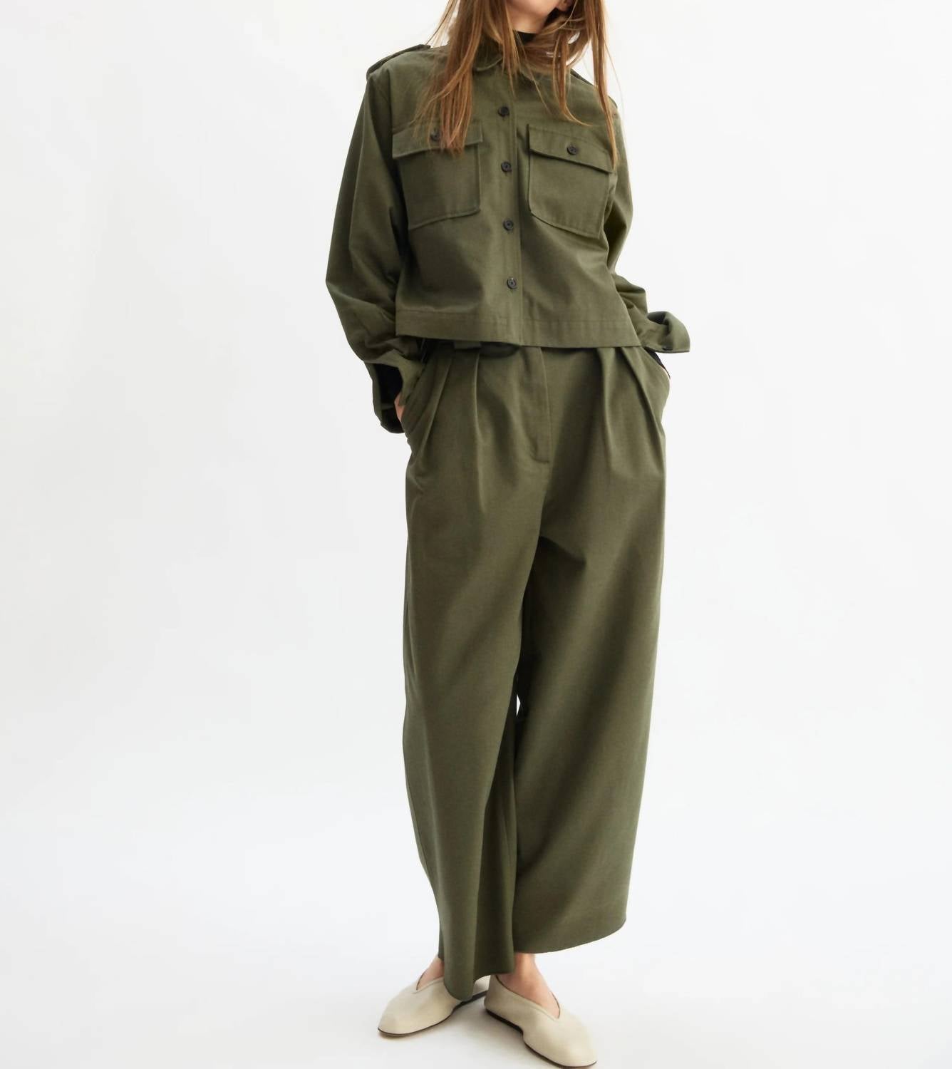 Introducing the Henry Short Shirt Jacket by Arlo Mott, a stylish olive piece perfect for springtime and holiday parties. This women's casual jacket features full-length sleeves, a collar neckline, and utility-inspired details like epaulets at the shoulders and real horn buttons, with functional pockets adding practicality. Crafted from 100% Japanese Twill and made in New York, it offers a swingy shape that fits true to size. Closure: Button closure. Care: N/A. Model is 5'9" and wears a size small.